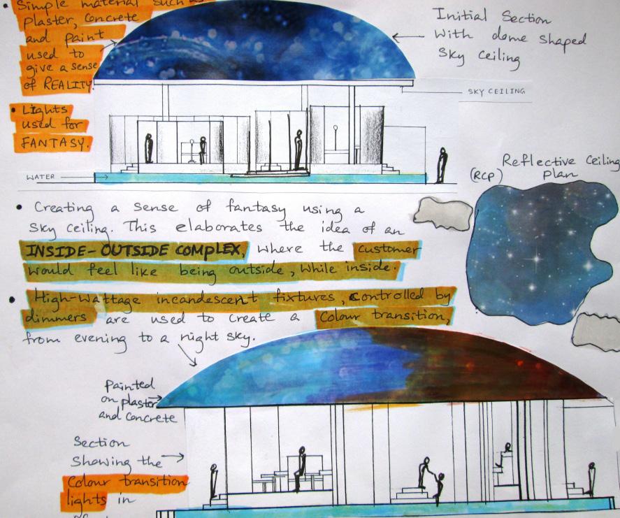 In a creative component, I applied those guidelines to a castle-themed casino hotel in the Midwest. I proposed a new theme for the hotel lobby, which focused on blending the nuances of Southeast Asian culture with the modernity of Western culture. The design aimed to reflect on the contrast between Western society’s preference for brightness and Eastern cultures’ appreciation for shadows and traces of light.