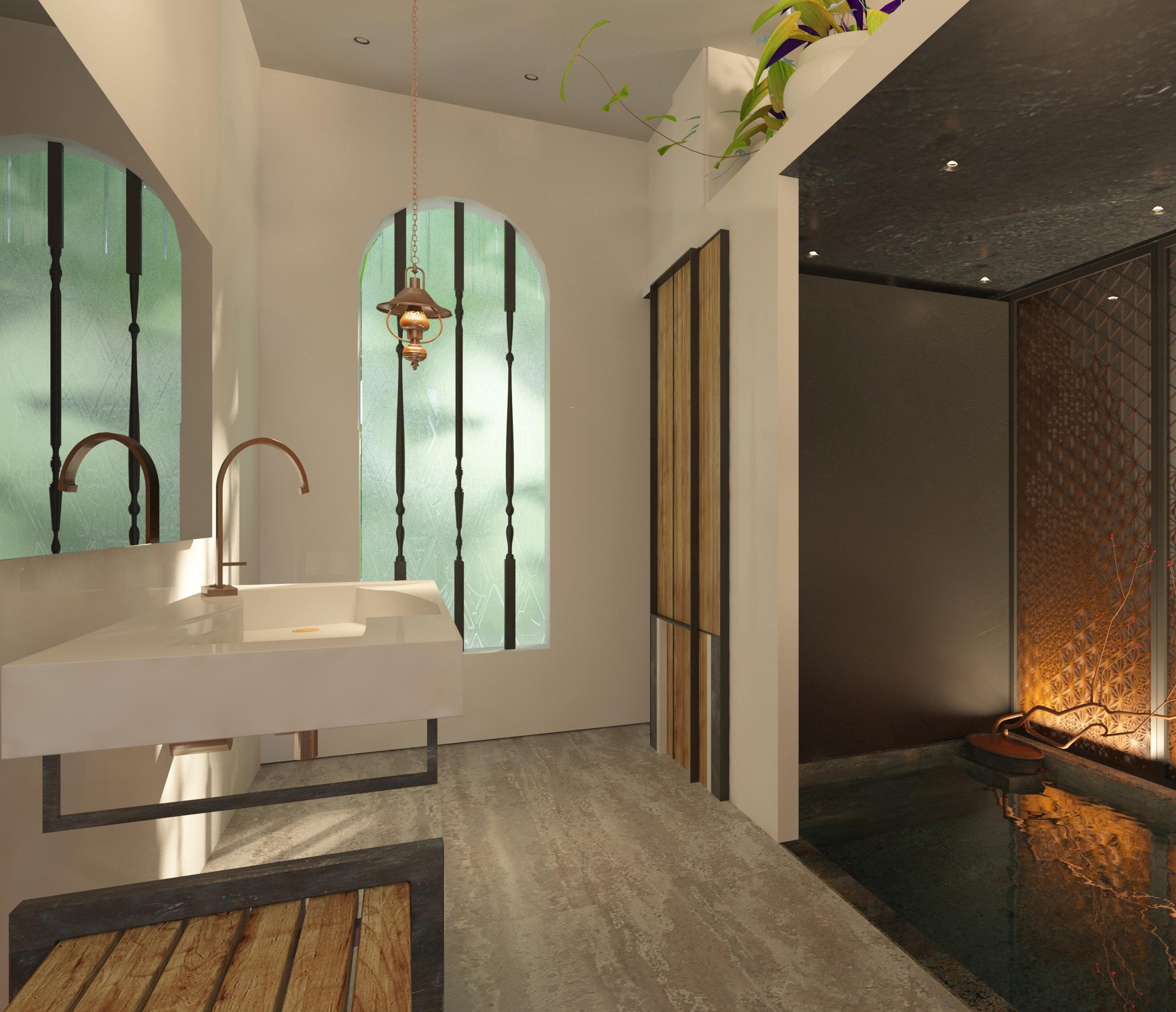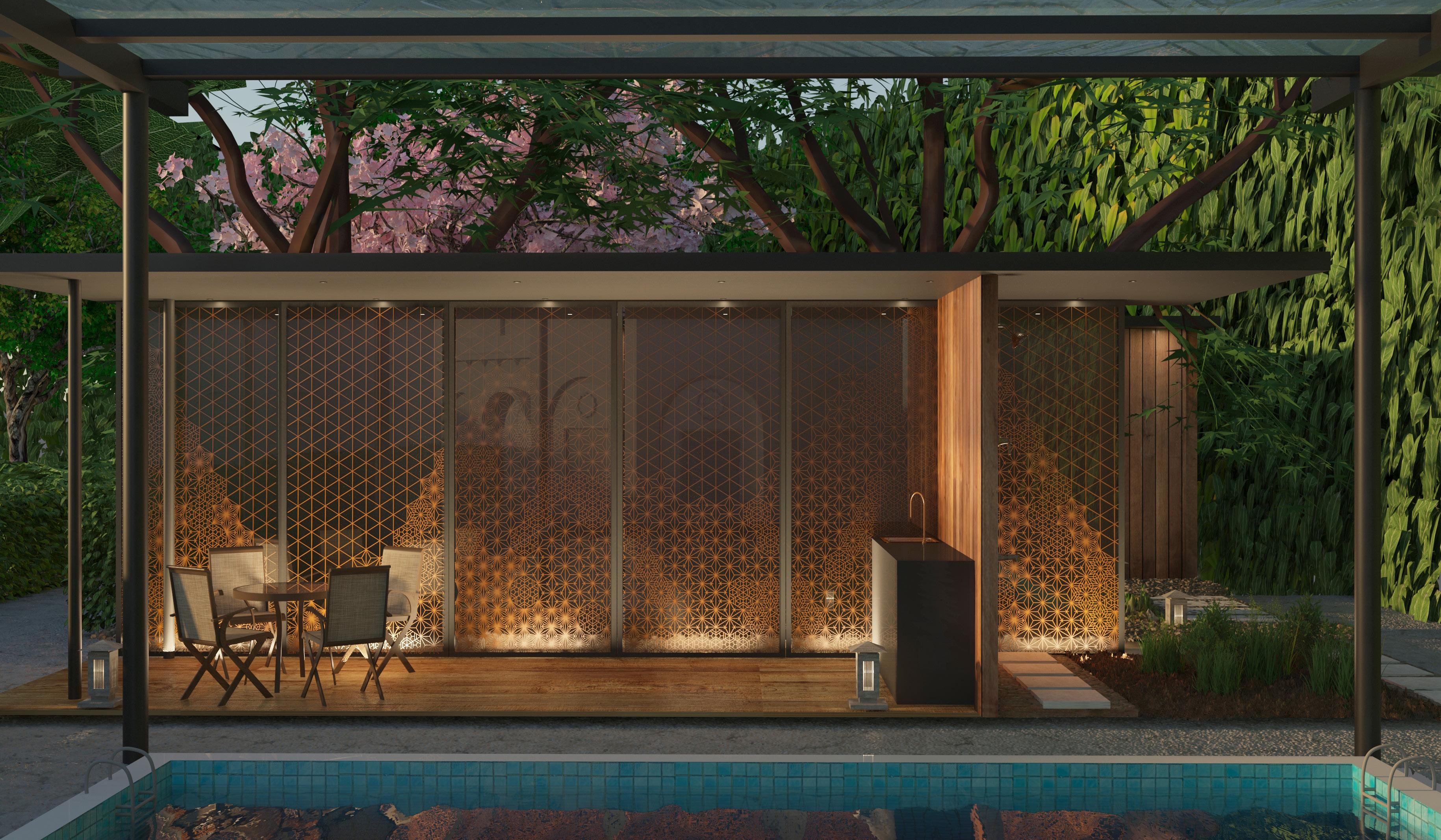 The design concept was to blend Japanese and Moorish elements to create a unique style. It was done as a nod to the original design of the U.S. Ambassadors Residence, which too was a mix of Japanese, Moorish and Classical styles, created at a whim of the architects involved. A key feature of the pool house was the handcrafted Kumiko screens used as a dividing wall between the compartments.