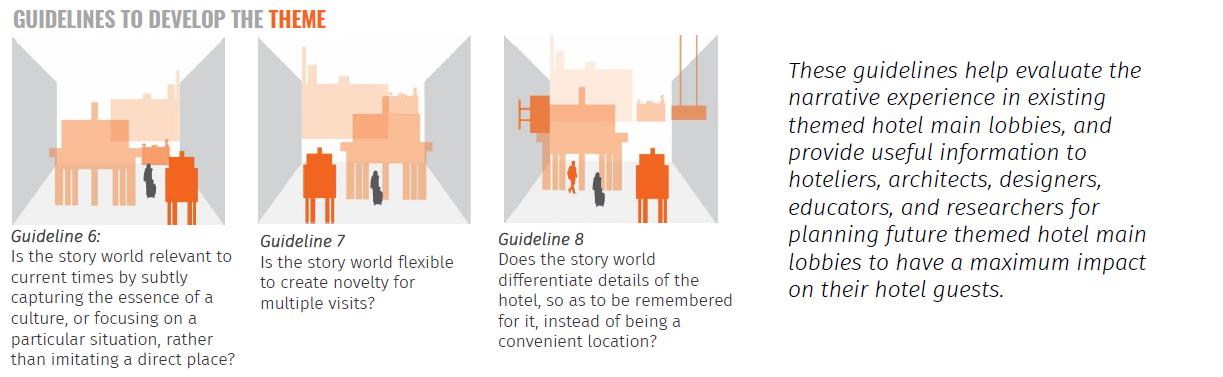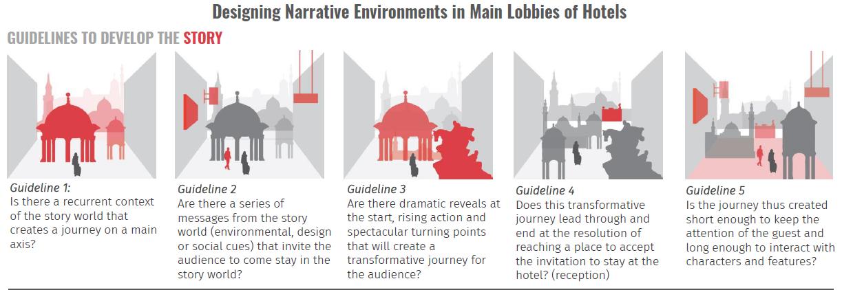The process included analyzing 6 themed hotel main lobbies in Las Vegas by applying narrative theories. The case studies and interviews with hotel staff led to the development of 8 guidelines for applying narrative environments to hotel lobbies.