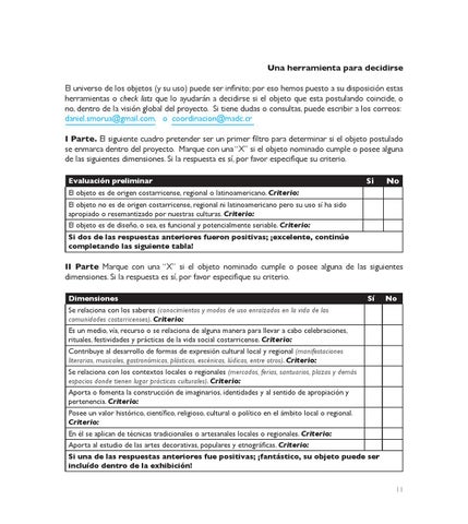 Una herramienta para decidirse El universo de los objetos (y su uso) puede ser infinito; por eso hemos puesto a su disposición estas herramientas o check lists que lo ayudarán a decidirse si el objeto que esta postulando coincide, o no, dentro de la visión global del proyecto. Si tiene dudas o consultas, puede escribir a los correos: daniel.smorua@gmail.com. o coordinacion@madc.cr I Parte. El siguiente cuadro pretender ser un primer filtro para determinar si el objeto postulado se enmarca dentro del proyecto. Marque con una “X” si el objeto nominado cumple o posee alguna de las siguientes dimensiones. Si la respuesta es sí, por favor especifique su criterio. Evaluación preliminar