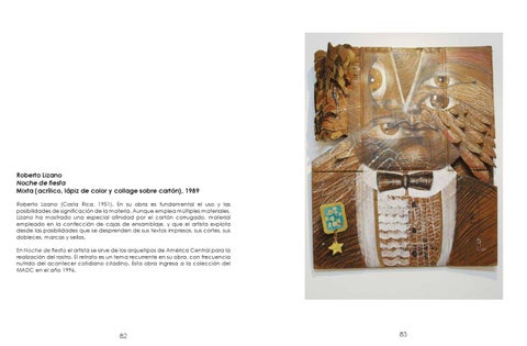 Roberto Lizano Noche de fiesta Mixta (acrílico, lápiz de color y collage sobre cartón), 1989 Roberto Lizano (Costa Rica, 1951). En su obra es fundamental el uso y las posibilidades de significación de la materia. Aunque emplea múltiples materiales, Lizano ha mostrado una especial afinidad por el cartón corrugado, material empleado en la confección de cajas de ensamblaje, y que el artista explota desde las posibilidades que se desprenden de sus textos impresos, sus cortes, sus dobleces, marcas y sellos. En Noche de fiesta el artista se sirve de los arquetipos de América Central para la realización del rostro. El retrato es un tema recurrente en su obra, con frecuencia nutrido del acontecer cotidiano citadino. Esta obra ingresa a la colección del MADC en el año 1996.