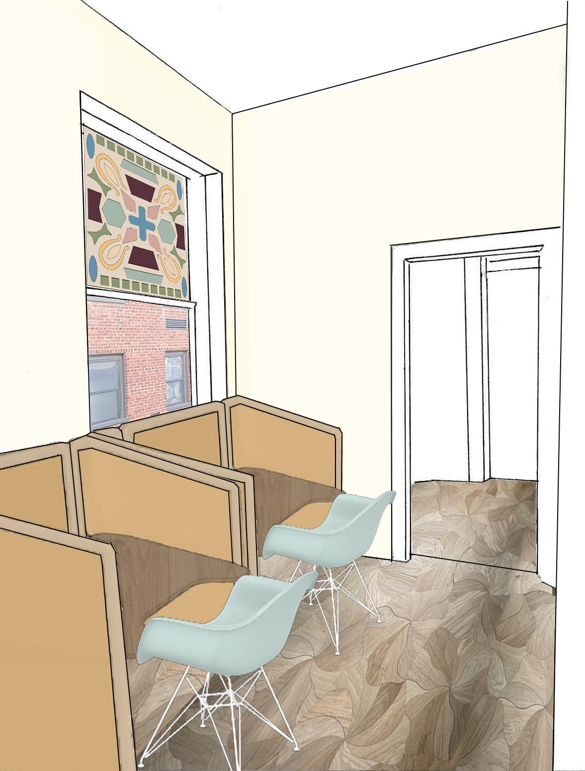 My intervention proposes to use simplified forms, drawn from both historical and contemporary elements in Hunton’s foyer, as the basic design language to guide the creation of new stained glass light fixtures and the selection of new furnishings.