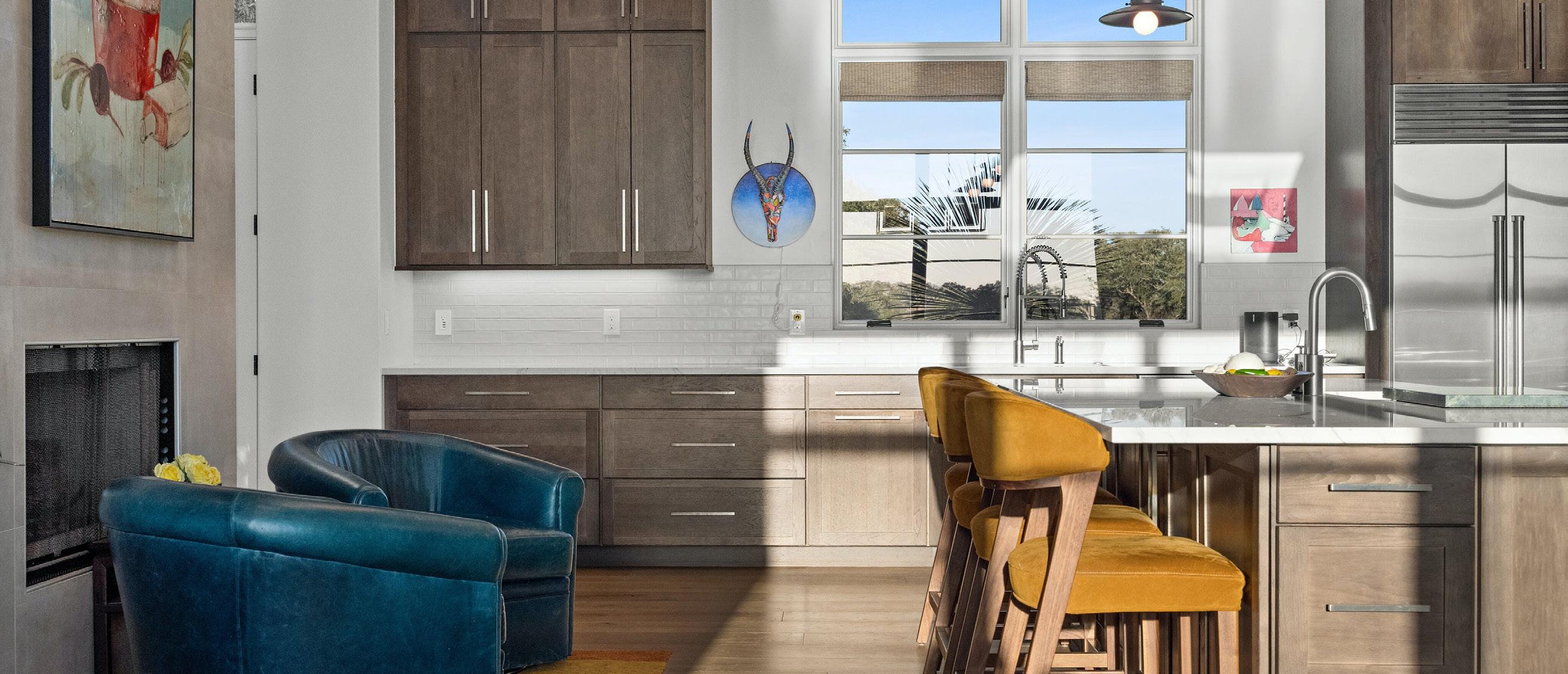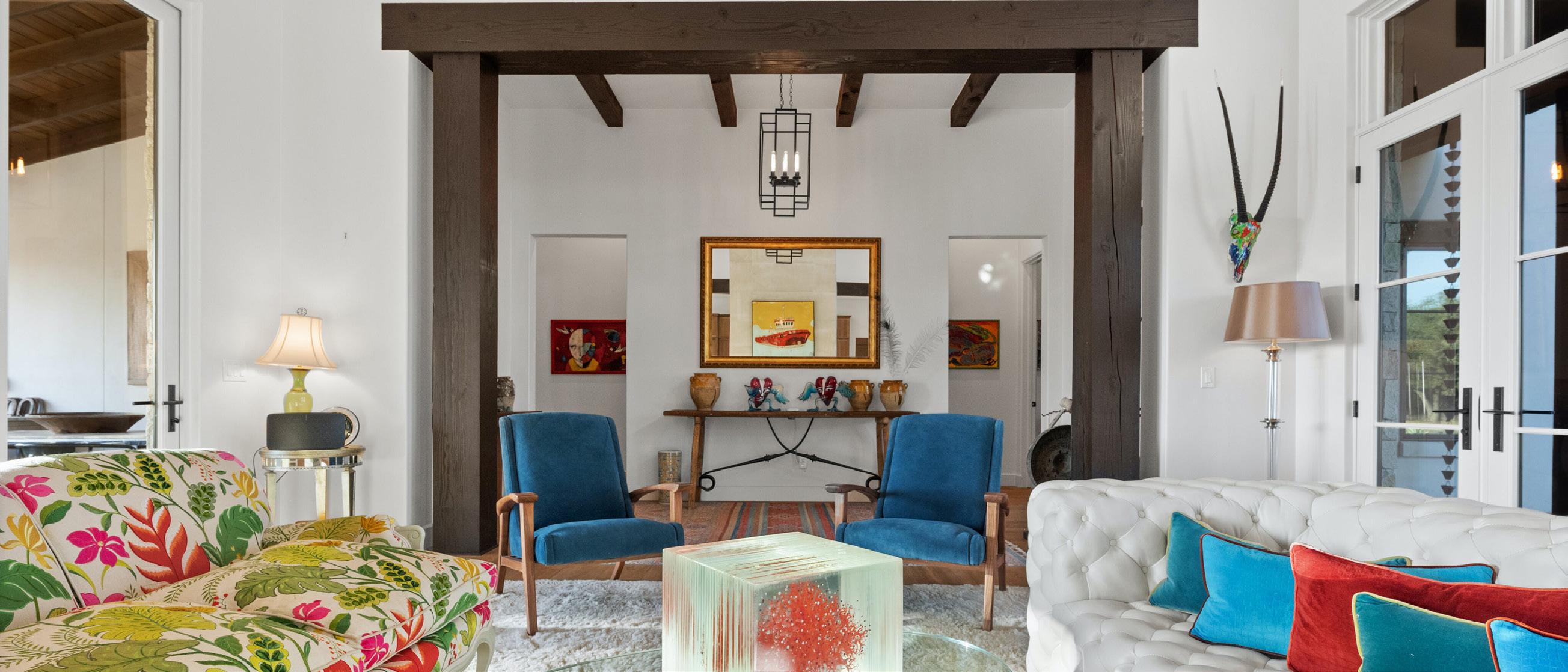 The Flying Rose Ranch main estate is modern luxury in a serene Texas hill country setting. It is comprised of four full bedrooms, four and a half bathrooms, a den, several covered porches, an outdoor living area and kitchen, and three gas fireplaces, sitting on just over 23 freedom-loving acres. Nestled at the back of Hunter’s Ridge development, this property is one of the most exclusive and private of the 7 ranches and backs up to private reserved land to never be developed. The main estate boasts impeccable design and attention to detail with floor-to-ceiling windows, large-plank white oak flooring, bullnose corners, and four-season texture on every wall and ceiling. With a nod to the Texas hill country, you will find warm woods and neutrals woven throughout the property including the vaulted ceiling and doorways. The kitchen features a Wolf range oven and microwave, a subzero built-in fridge, double sinks, quartzite countertops, and a two-sided fireplace creating a cozy divide between the kitchen and formal living space. The cabinetry was custom-built for the property by a local craftsman and features soft-close drawers and ample storage. Accompanying the chef's kitchen you will find a large walk-in pantry with floor-to-ceiling storage, and a window allowing natural light to come through. Across from the pantry sits a large mudroom with an additional sink, refrigerator, and washer/dryer.