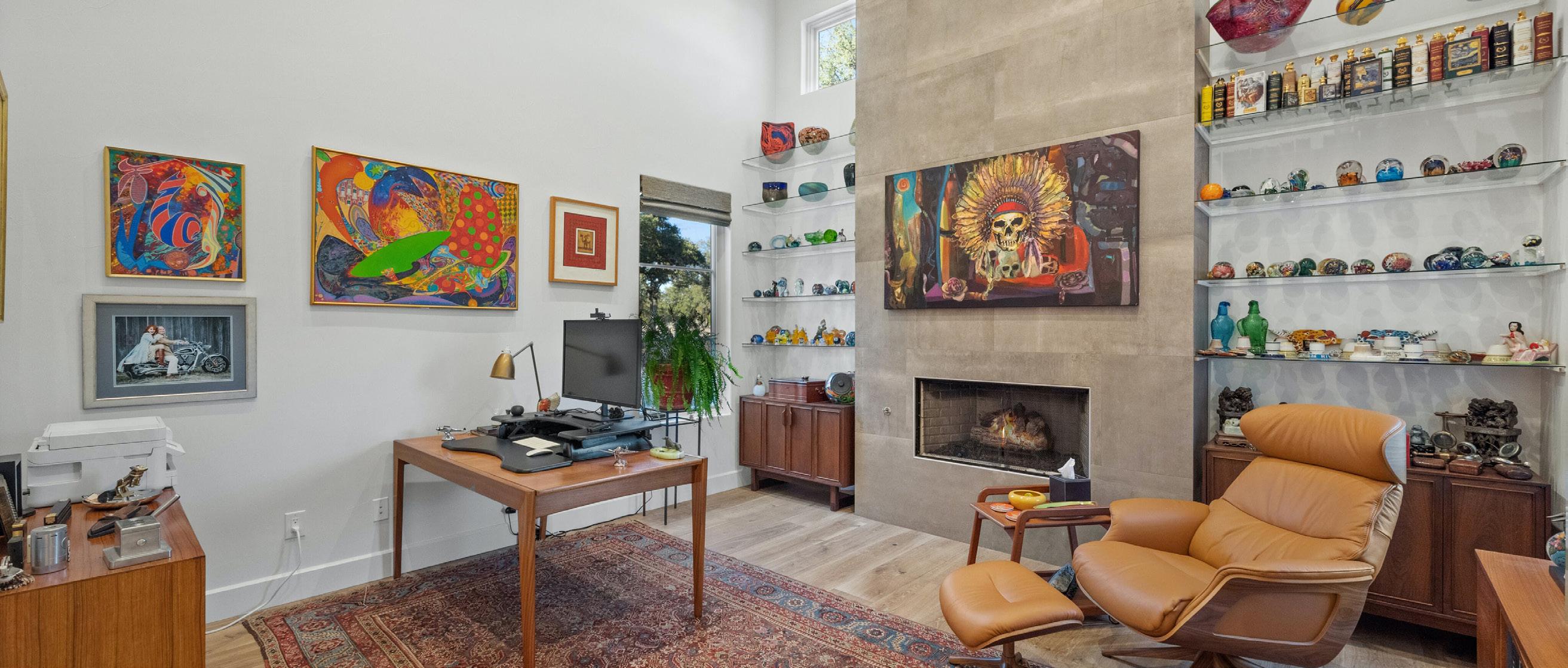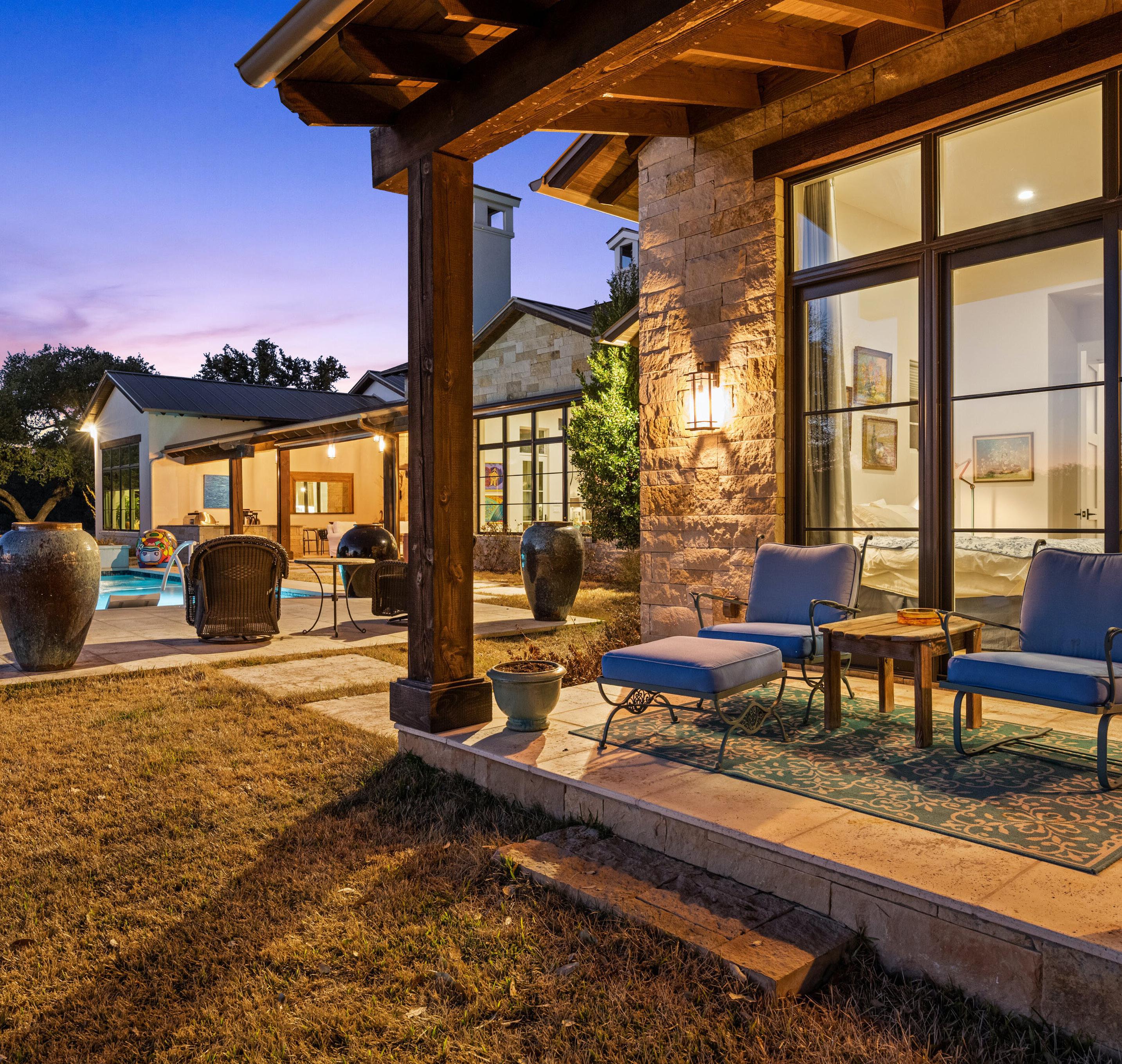 Tucked away in the right wing of the estate you will find the spacious primary suite with incredible hill country views, two large walk-in closets, a flex room, and his/her style ensuite. Take a quick turn into the ensuite and discover two bathrooms in one - each side accommodates storage, a full vanity, and a private water closet with a separate entrance to the main shower. The champagne marble tub is the perfect spot for the ultimate relaxation. Additionally, you will find a fourth bedroom and full bathroom, located in the front right corner of the home. Boasting a large gas fireplace, and vaulted ceilings, this room is currently used as a home office, but could also make a great guest suite or bedroom.