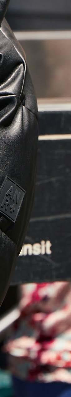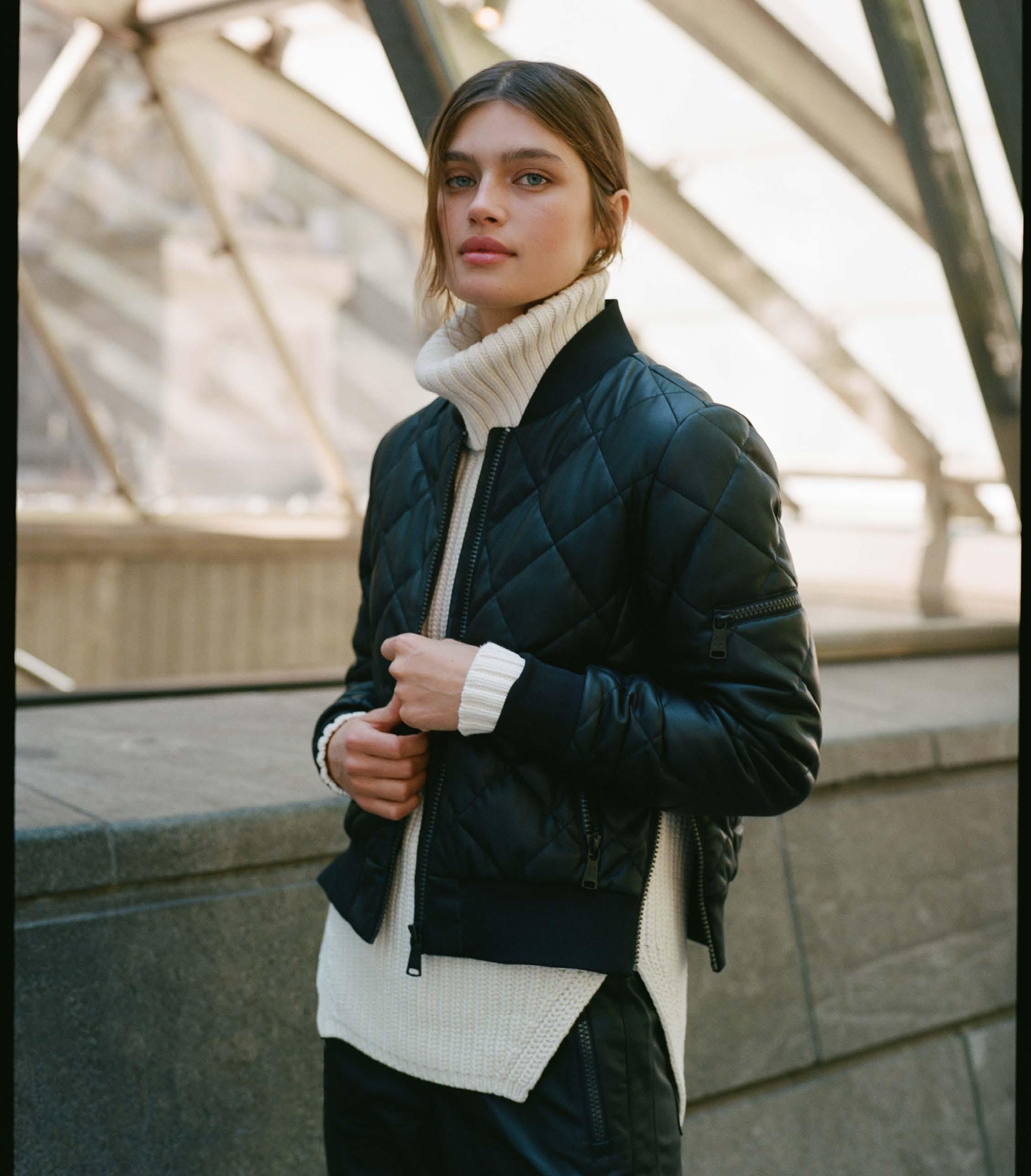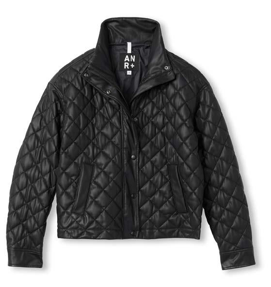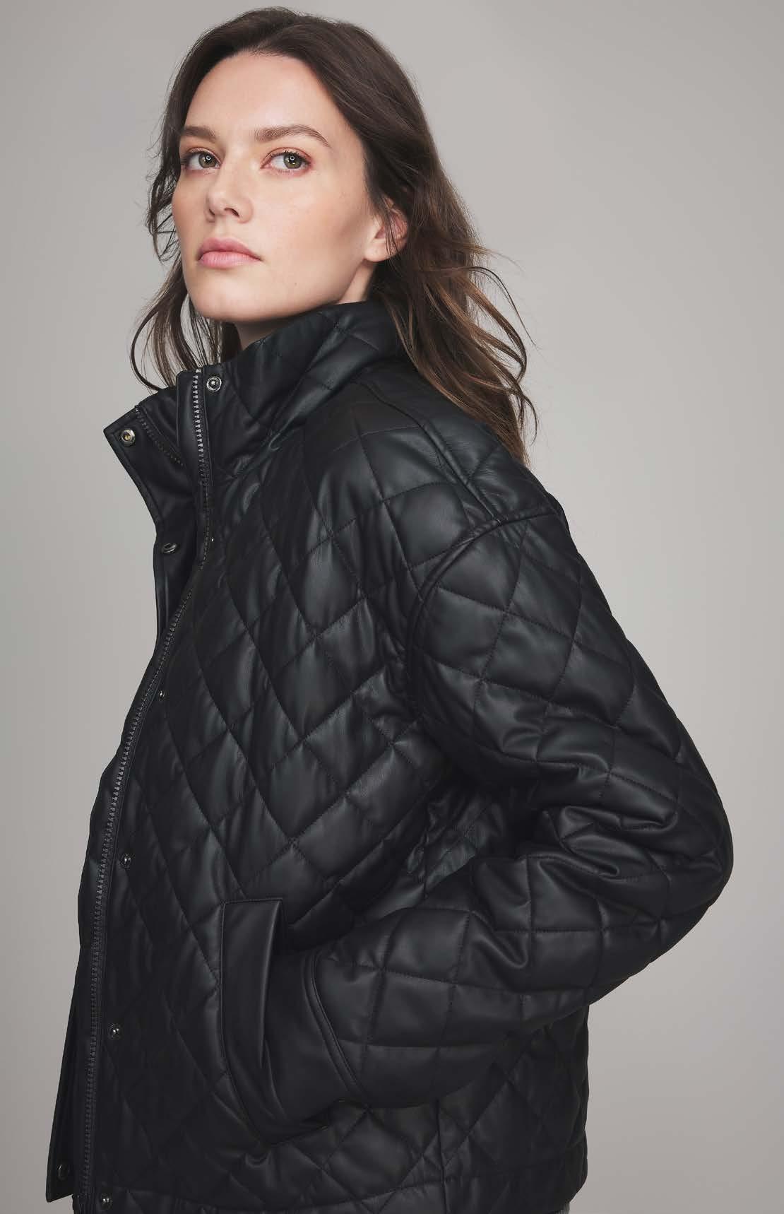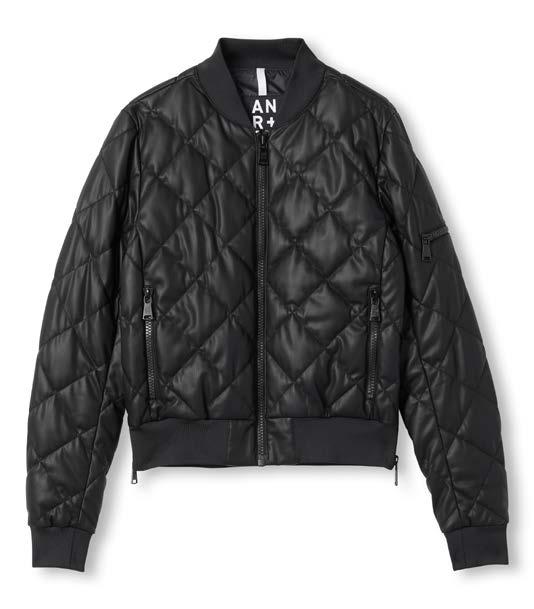On cover: Metro Bomber Jacket, Black Leather, 398 Harper Track Pant, Black Faux Leather $258