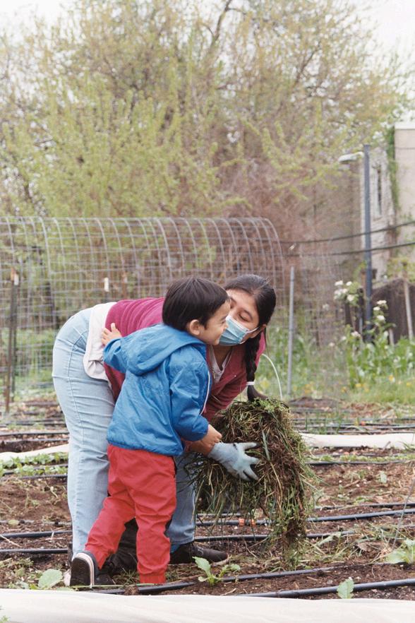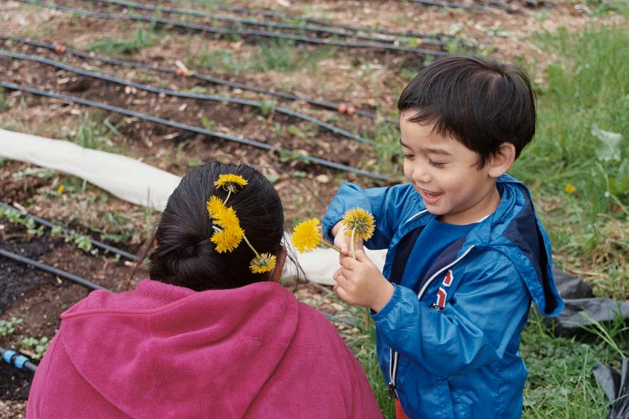 “You can see the smiles on their faces when they are in the gardens. I think they’re healing, you know.”AKarenfarmer’ssondecorateshismother’shairwithdandelionspicked fromthegardens