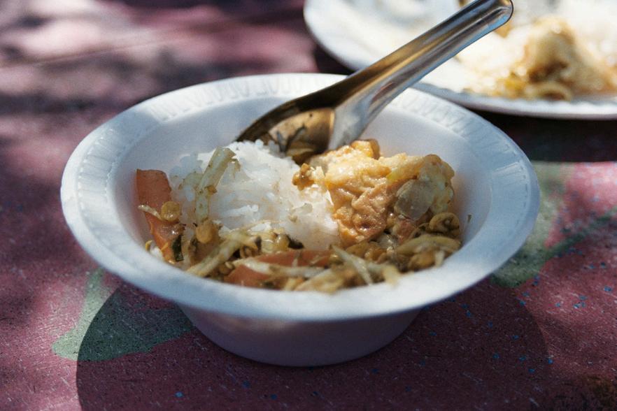 Bottom right: Farmers fill their plates with traditional food prepared by the Karen