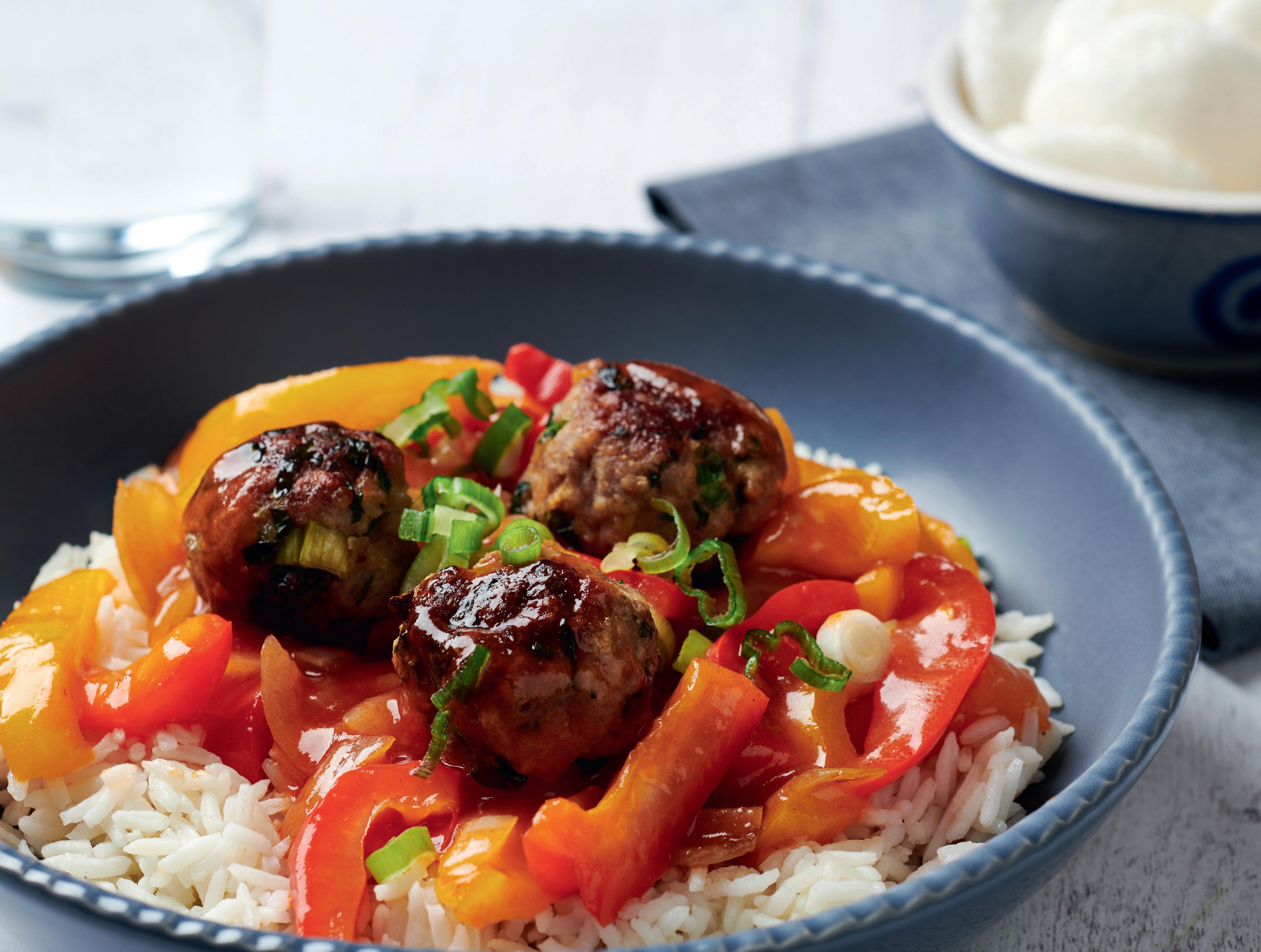 4. Add the onions and peppers to the frying pan, and cook for 5 mins, then add to the meatballs.