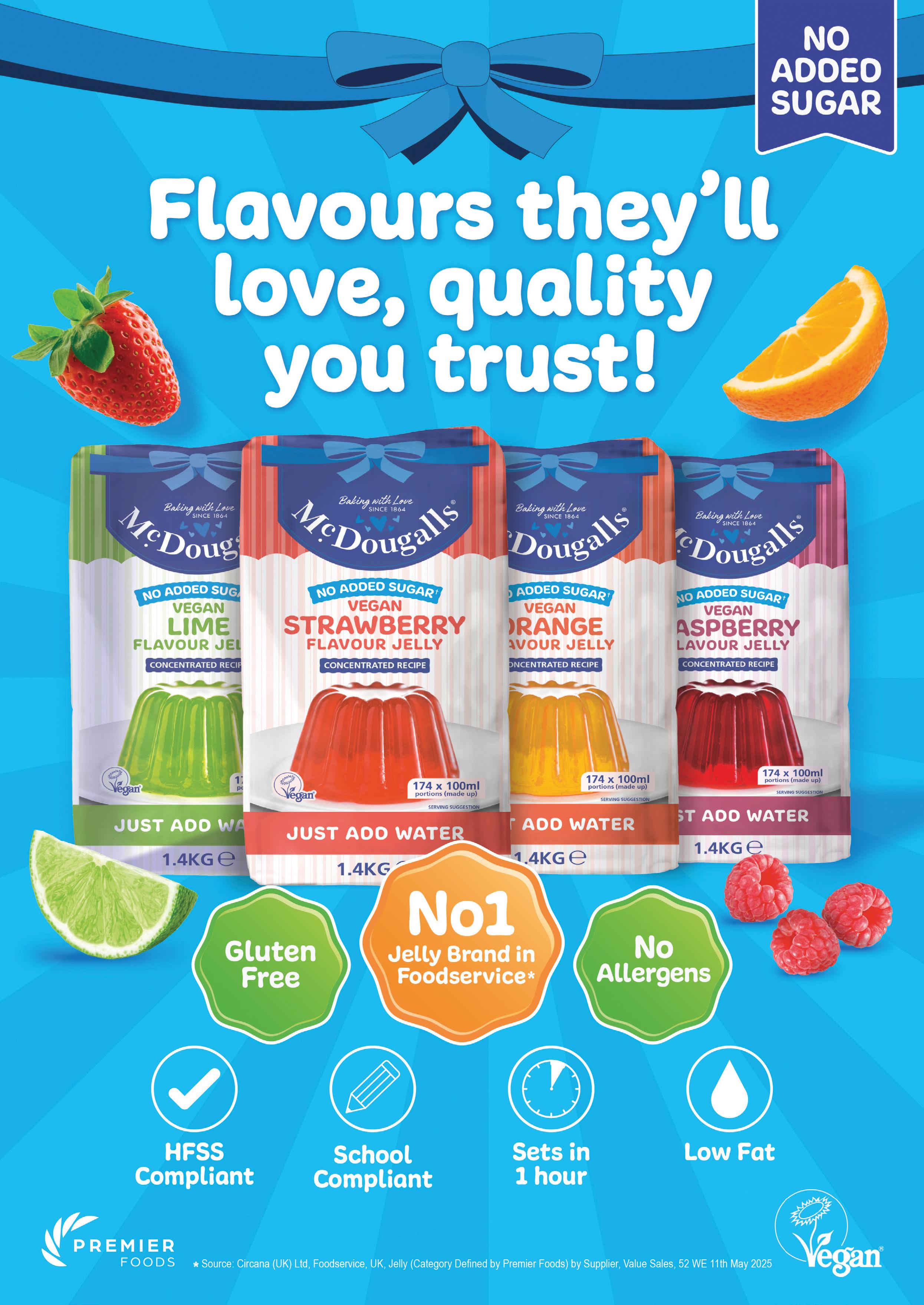Premier Foods’ McDougalls No Added Sugar Vegan Jelly is designed with caterers in mind, and ticks every box for inclusive menus. It’s vegan, gluten-free, non-HFSS and free from all major allergens, making it perfect for education, care and health-focused settings. Each 1.4kg pack makes around 174 x 100ml portions and sets in an hour, saving time without compromising on flavour. Available in four flavours – Strawberry, Raspberry, Orange and Lime – this flexible solution brings peace of mind to dessert planning.