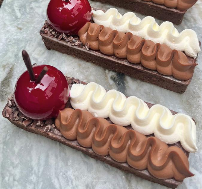 “A take on the classic with a fun twist. Sour cherry, rich chocolate and light fluffy cream... yum! Customers love the sphere of chocolate crémeux that looks like a cherry”