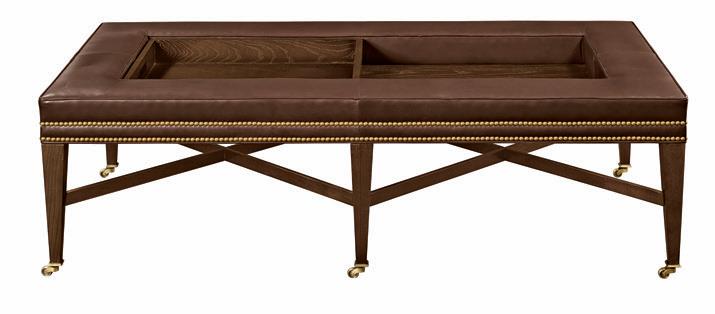Page 308-309: HC126-30 Bexley Cocktail Ottoman made as a special construction 76 x 39 inch Divan with one 996-96 bolster made with drawstring ends removed as 38 x 8 inch with leather straps across bolster ends and around divan. Optional NS-09 Antique Nickel nail head trim, shallow button tufts, bias cut welt and finished in Dark Walnut finish.