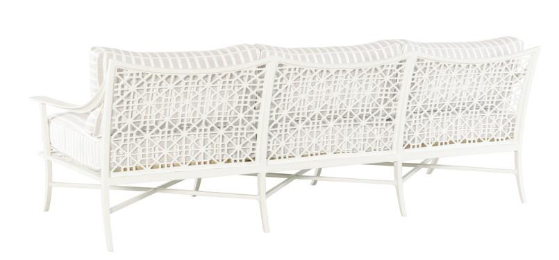 Three Blend-Down loose back cushions and three Spring-Down loose seat cushions, two 20-inch weltless throw pillows standard. Customizable skirt options available in eight skirt styles at no upcharge: Kick pleat, Pleated Corner, Box Pleat, Shirred Corner, Shirred Ruffle, Stacked Ruffle, Soft Shirred Skirt, Soft Stacked Shirred Skirt. *Shown with Dressmaker Skirt.