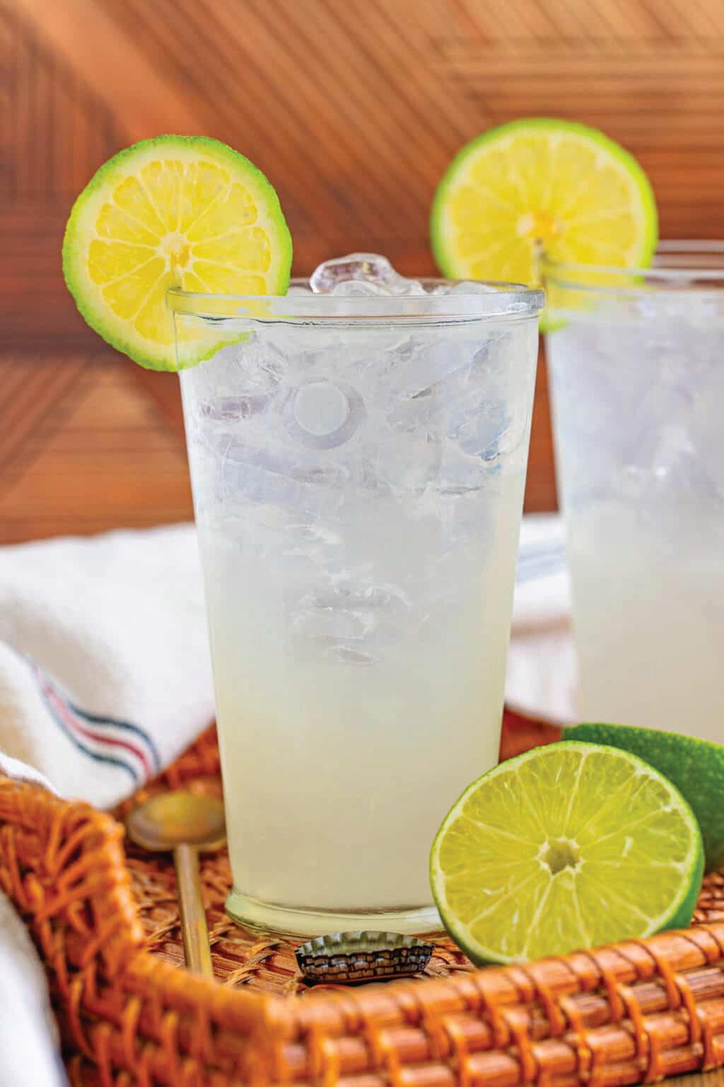 1.5 ounces Patrón Silver Tequila® .75 ounces Fresh Lime Juice 12 ounces Topo Chico® Mineral Water Lime wheels optional