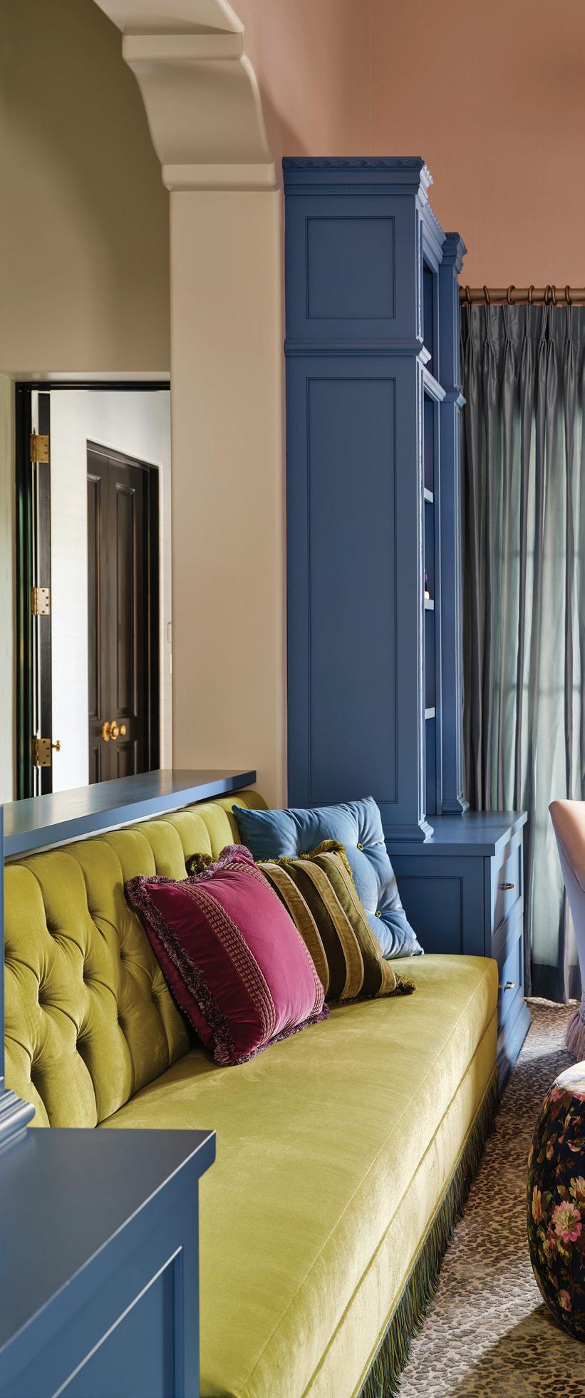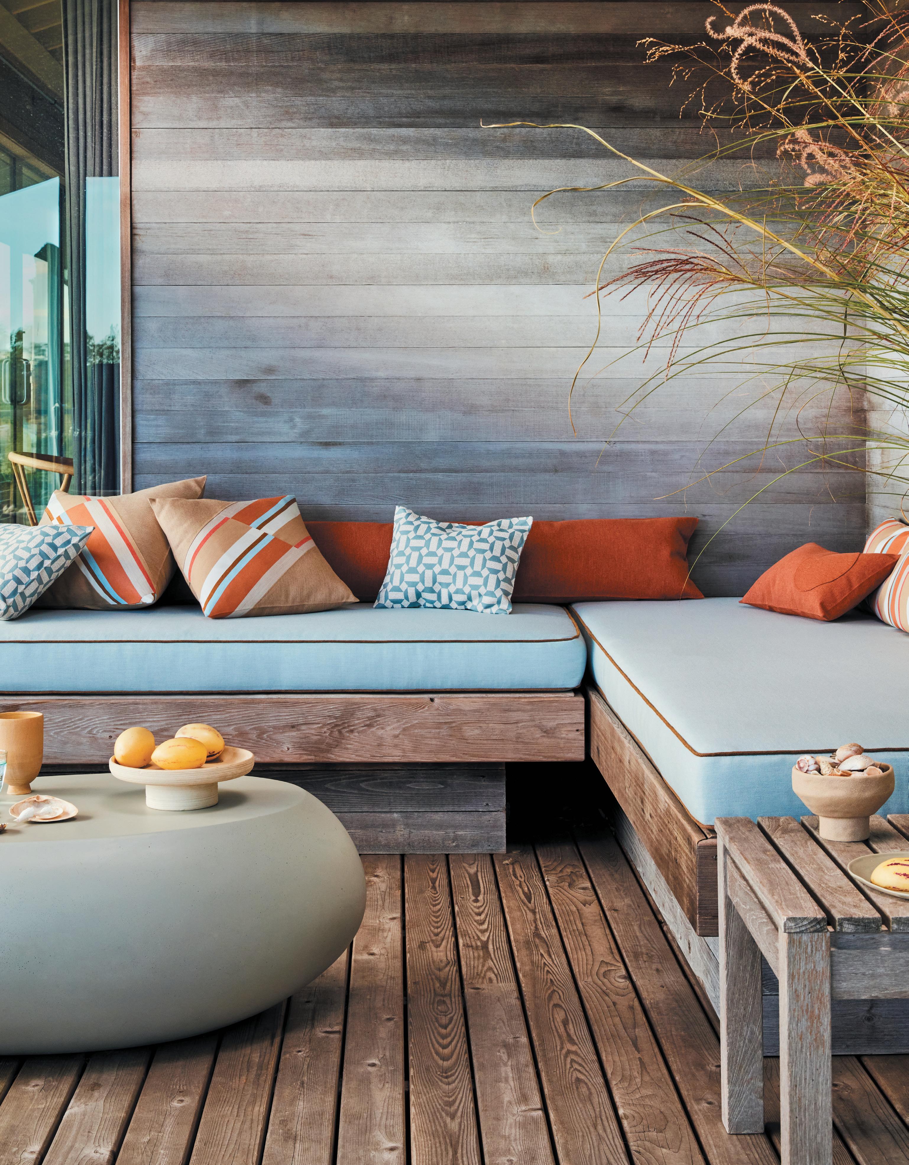 and bolsters in a stripe from Liberty® Fabrics make lounging lazily by the pool an exercise in chic,” shares Amanda.