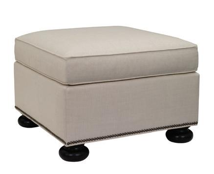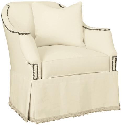 We chose the Eton Swivel and asked to remove the standard nail head trim. We chose a performance fabric from Perennials® and a contrasting welt all over. We also selected a Silhouettes M2M Ottoman to create a custom ottoman. We chose the size and an extra-long dressmaker skirt so that it would drape elegantly on the rug.