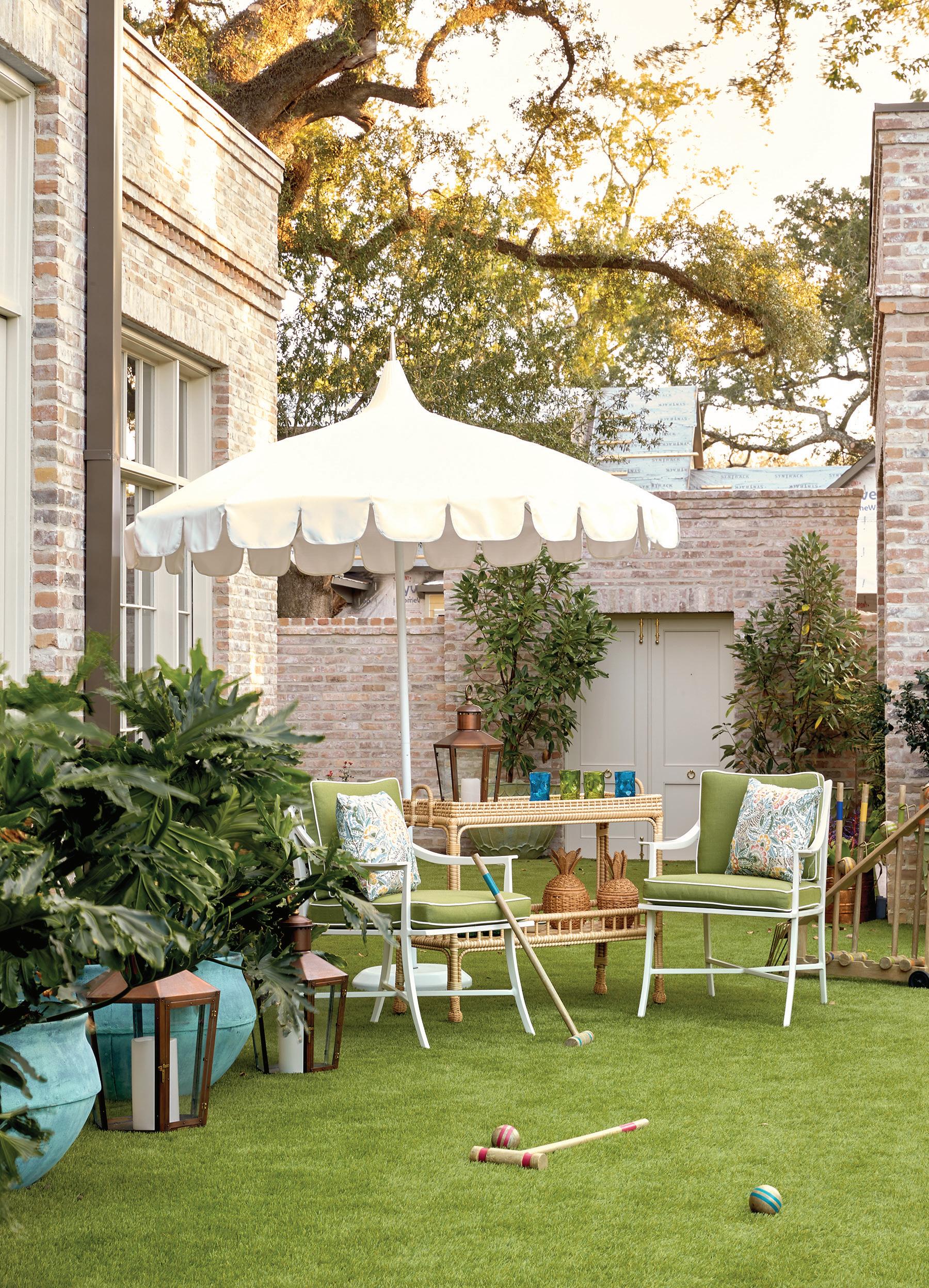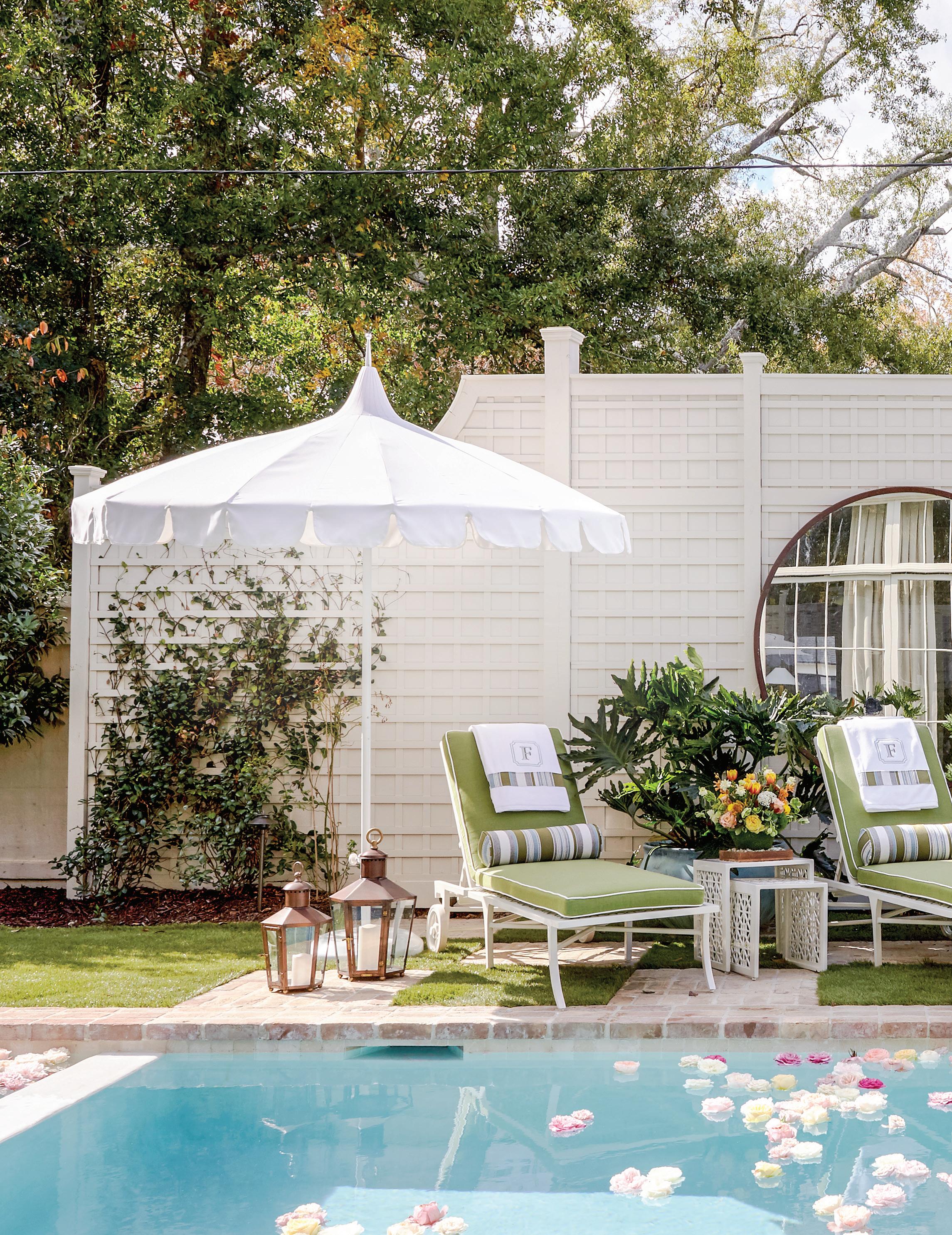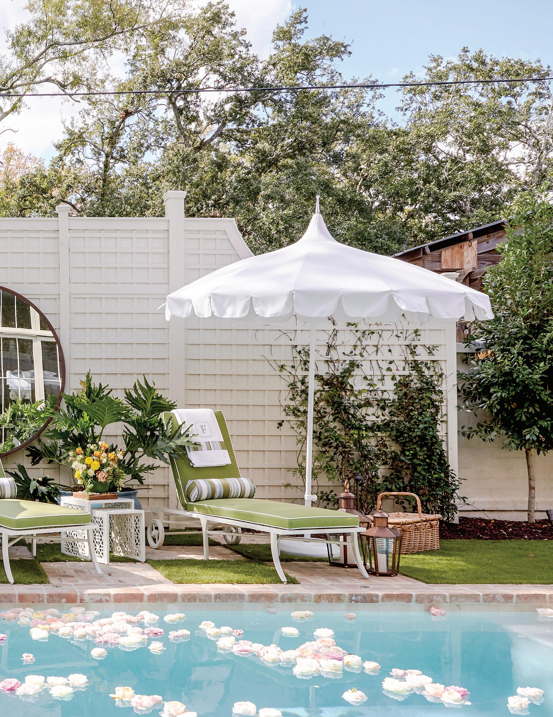 “Each of the outdoor living spaces felt inviting and livable. In particular, Hable’s chaises and nesting tables, scalloped umbrellas by Serena & Lily®,