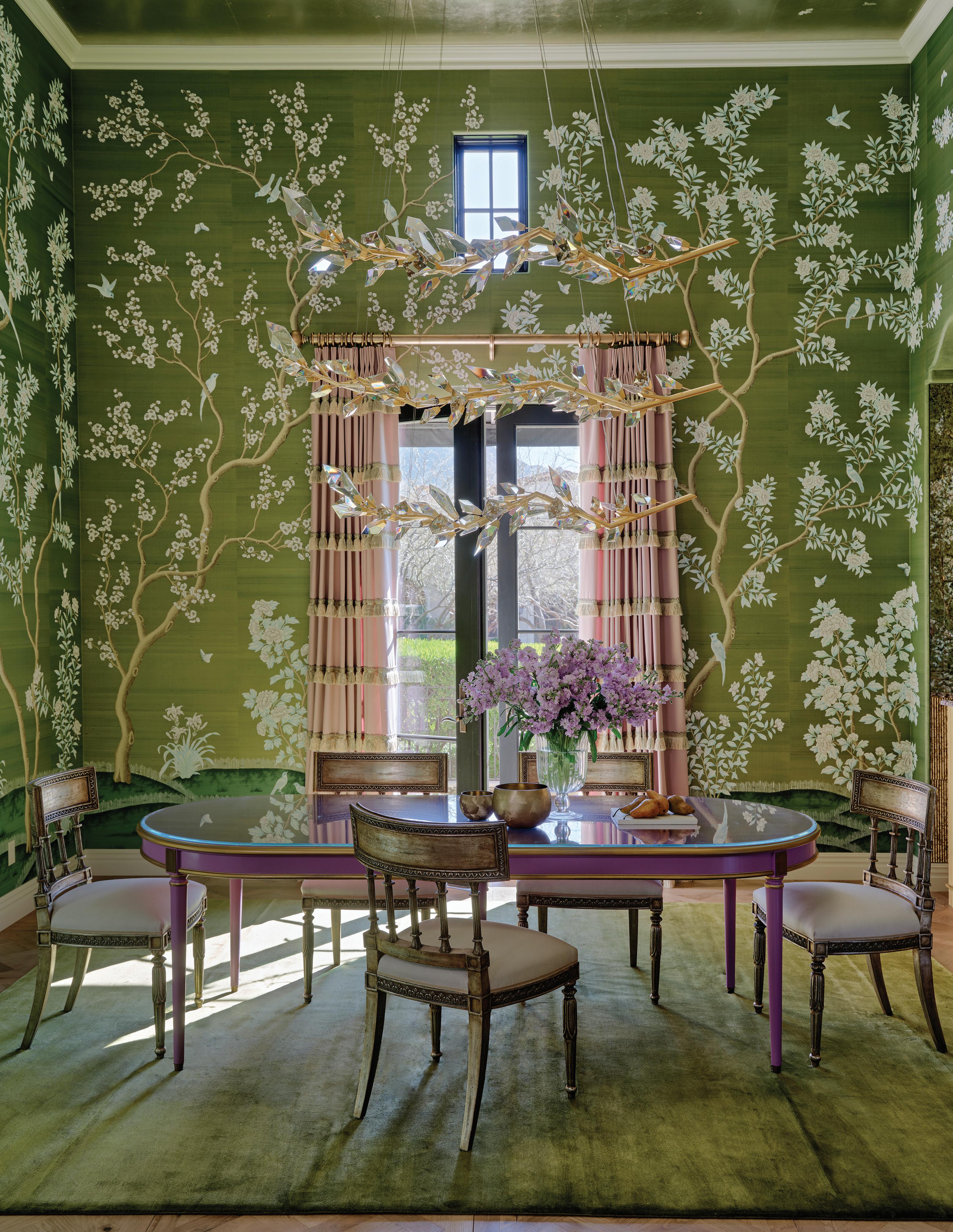 "Our client wished for classic elegance. The color palette, silver leaf and Gracie wallpaper was the perfect solution for their dining room." - KIM SCODRO