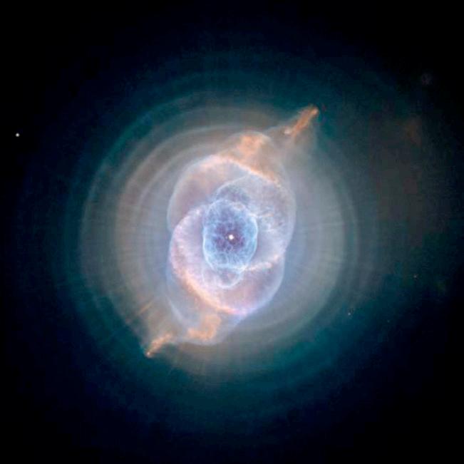 So what happens inside a star is that bigger and bigger atoms are created. Eventually, all the hydrogen inside the core is depleted, and then the star dies. And stars like the Sun unravel gently back into space. After a star like this dies and its nuclear reactions fades away, all of those wonderful new atoms and elements that it created will be distributed back into space. but no two stars die the same way.
