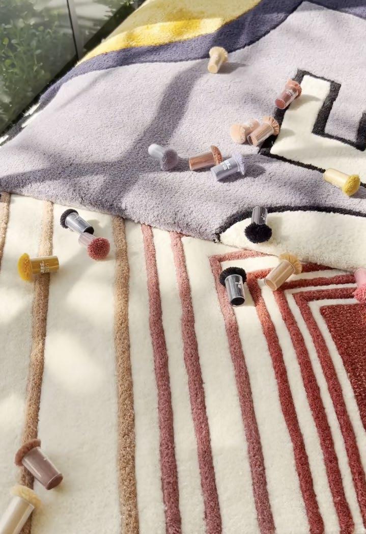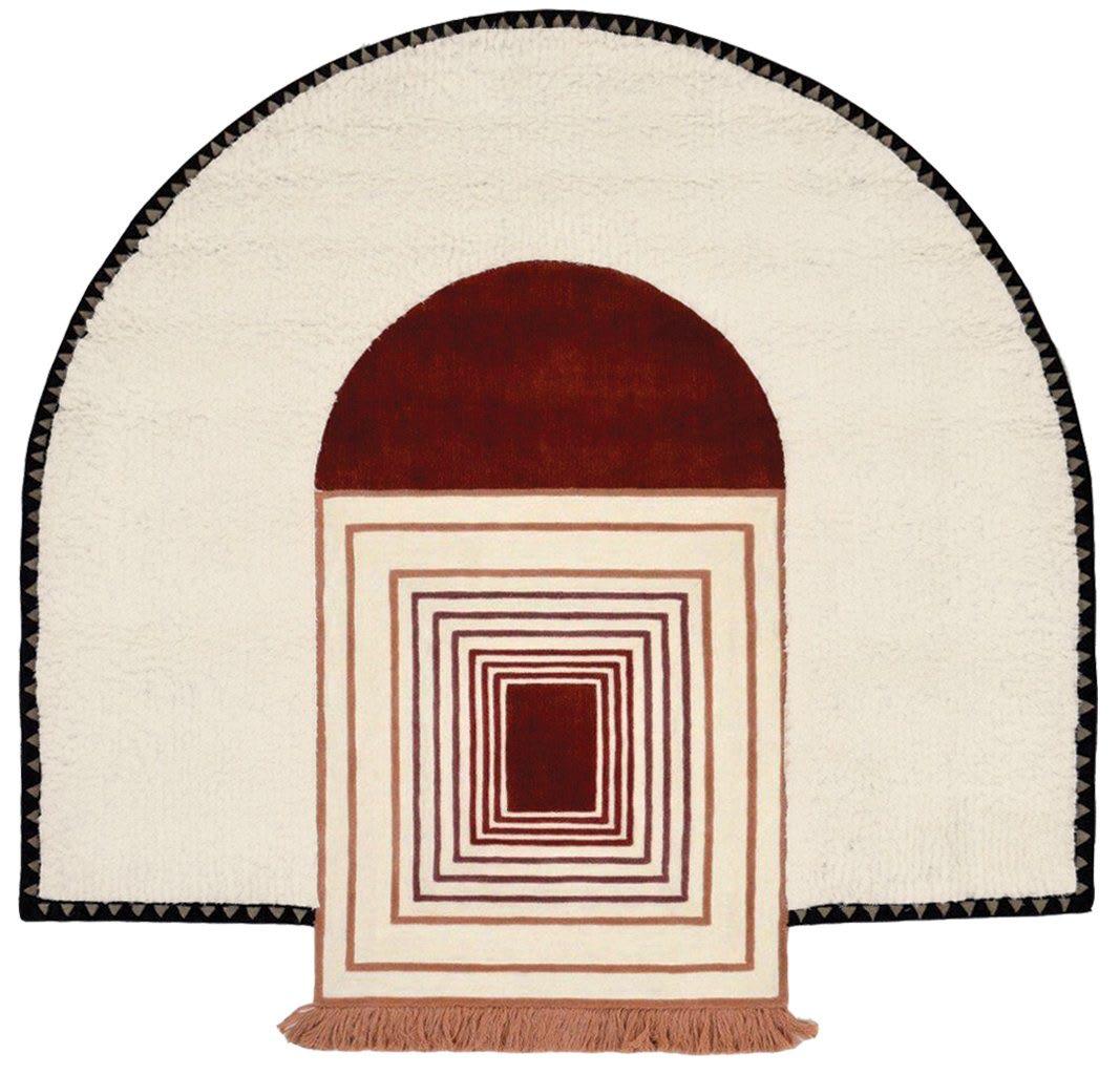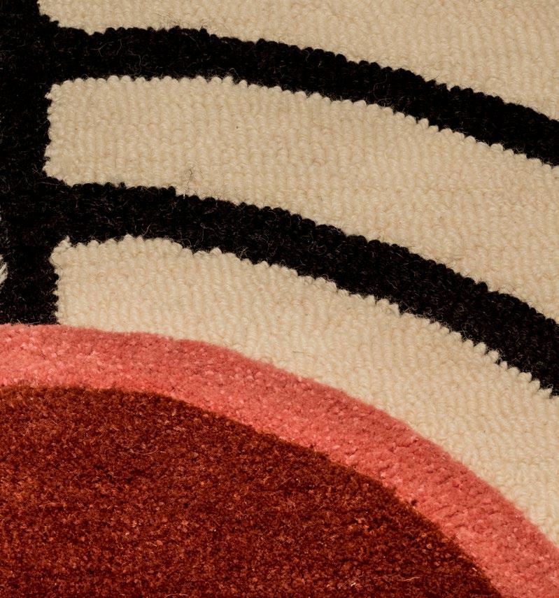 The Crest I track tapestry rug draws inspiration from the starting line of tracks run by athletes in the ancient Olympic Games. Nude neutrals and strong shapes combine to create an eclectic geometric vibe. This rug is hand-tufted in India, made with wool, silk, and shag. Can be paired together with Crest II to create a bigger rug.