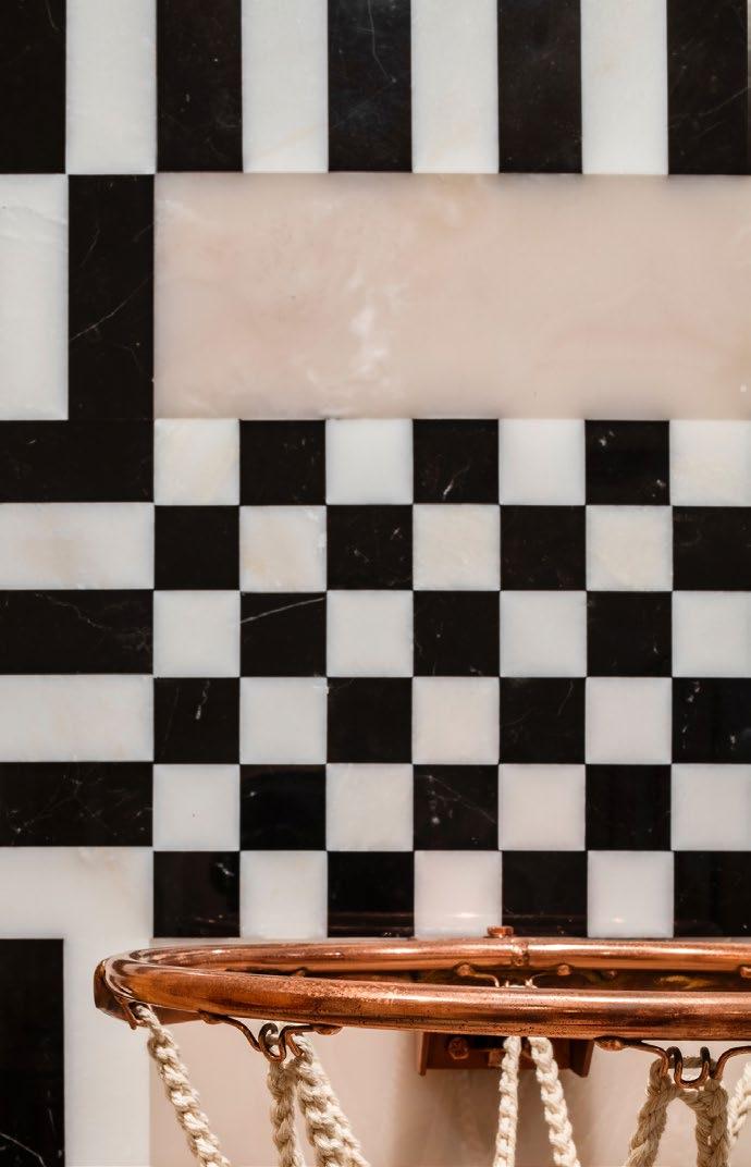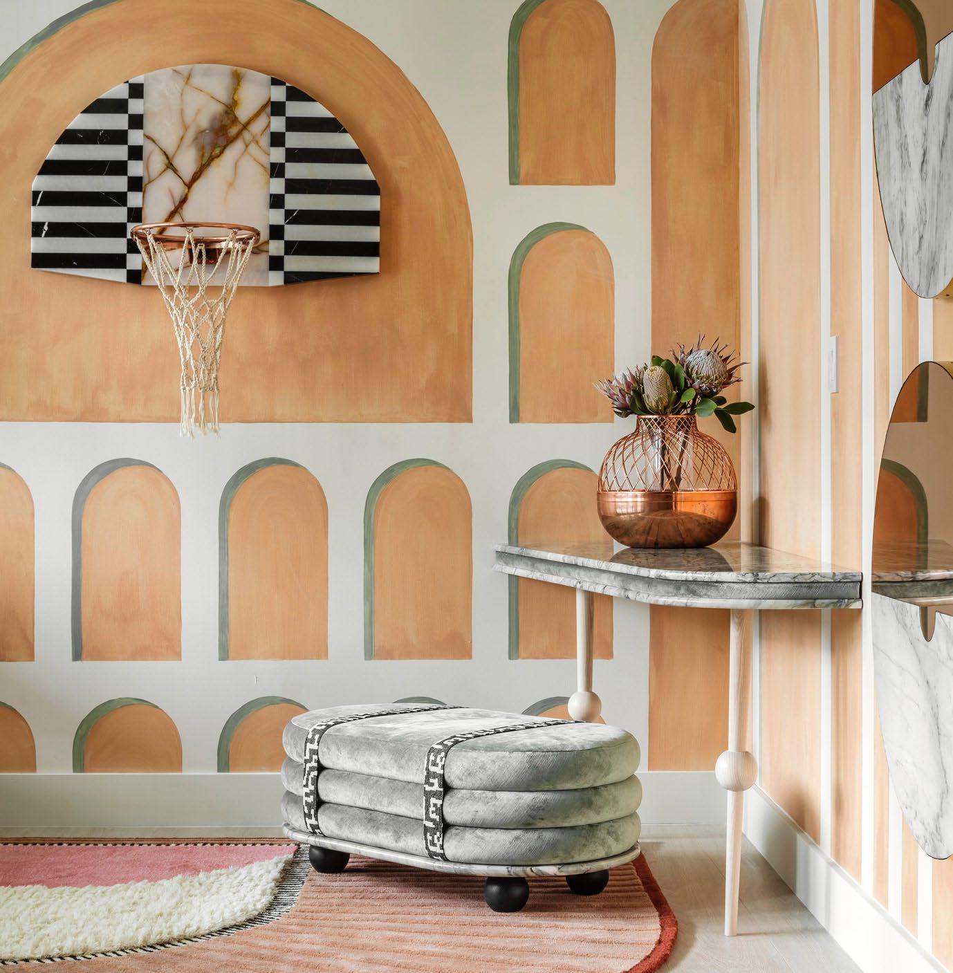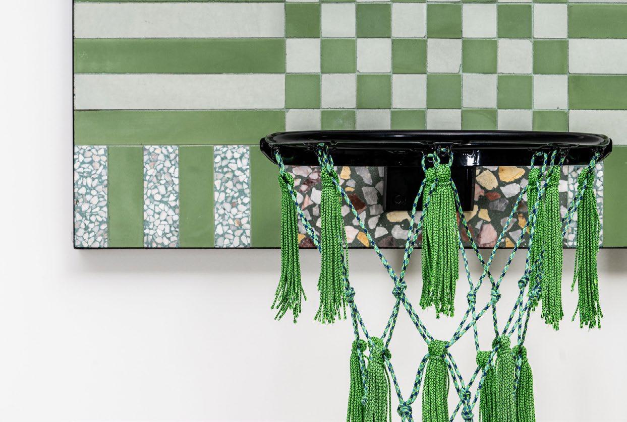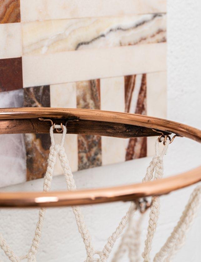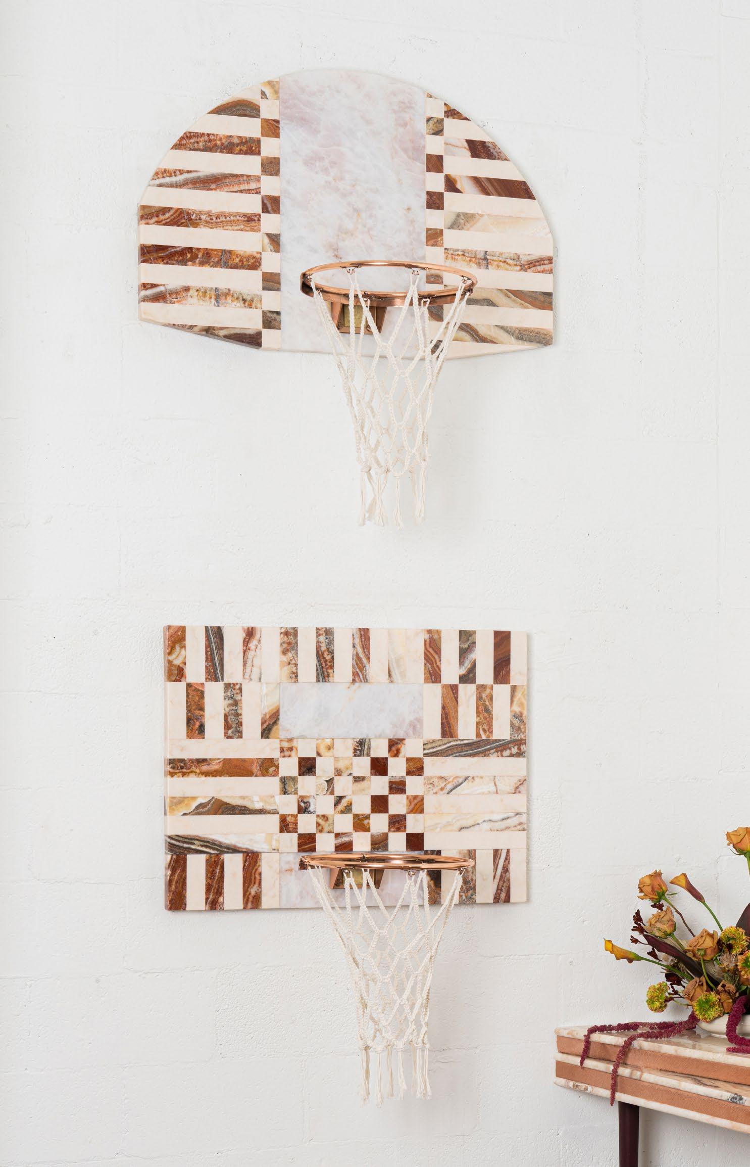 These wall-mounted basketball hoops combine marble, onyx, copper and hand-woven cotton thread to pay homage to the ancient elements of their inspiration.