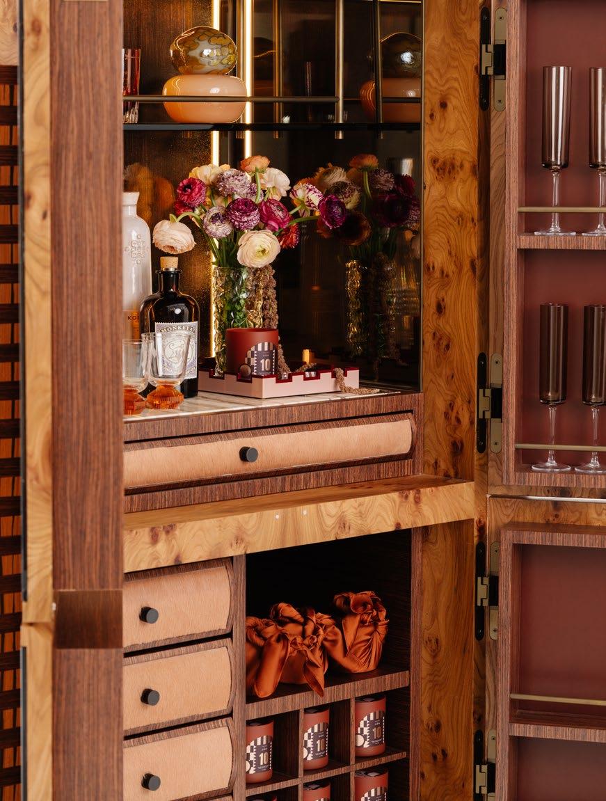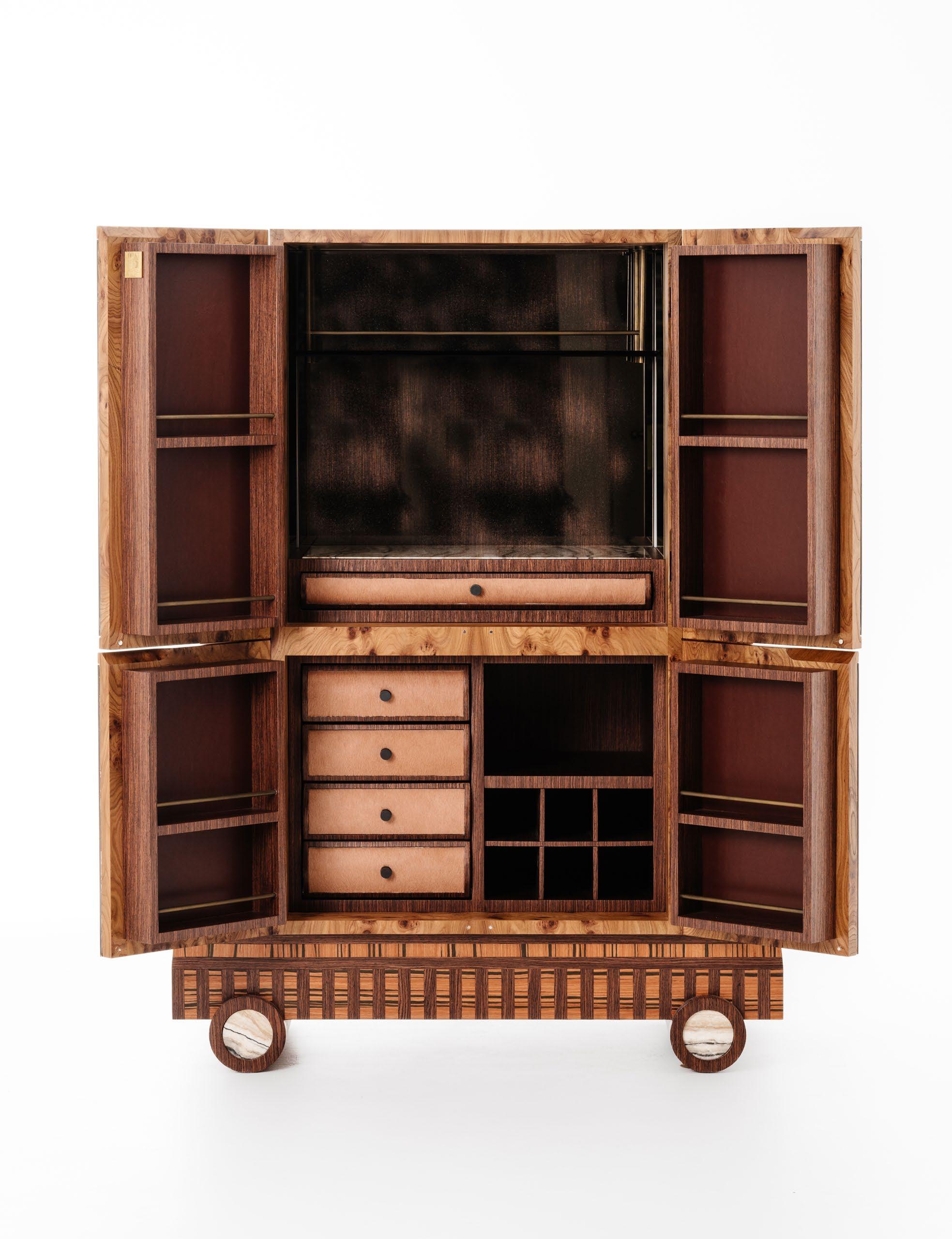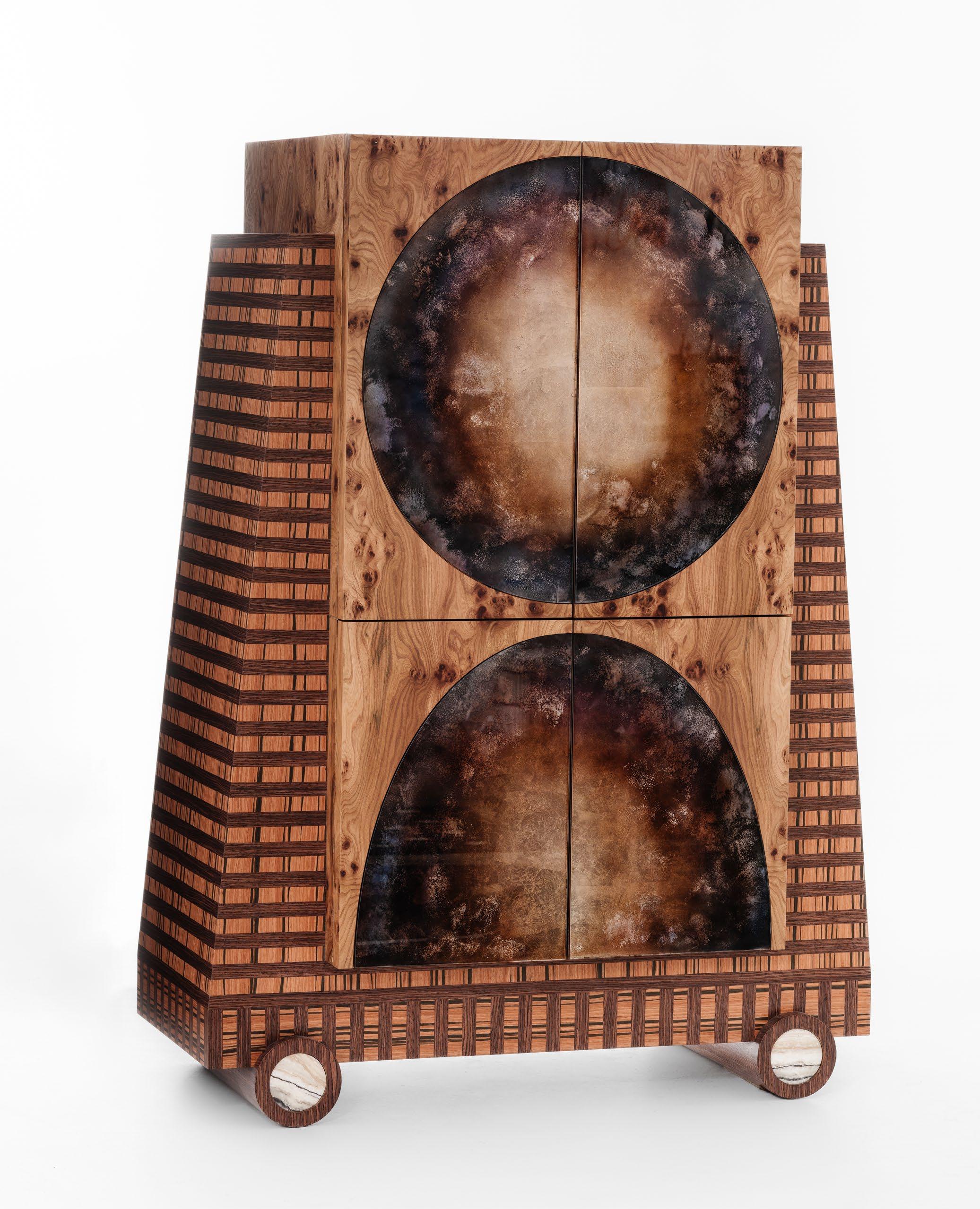 The graphic layering of exotic burled and cathedral grained woods create the elevated “locker” bar cabinet. Interiors are adorned in woods, hand-woven leather, a touch of onyx and the most exquisite eglomise mirror cladding the interiors walls.