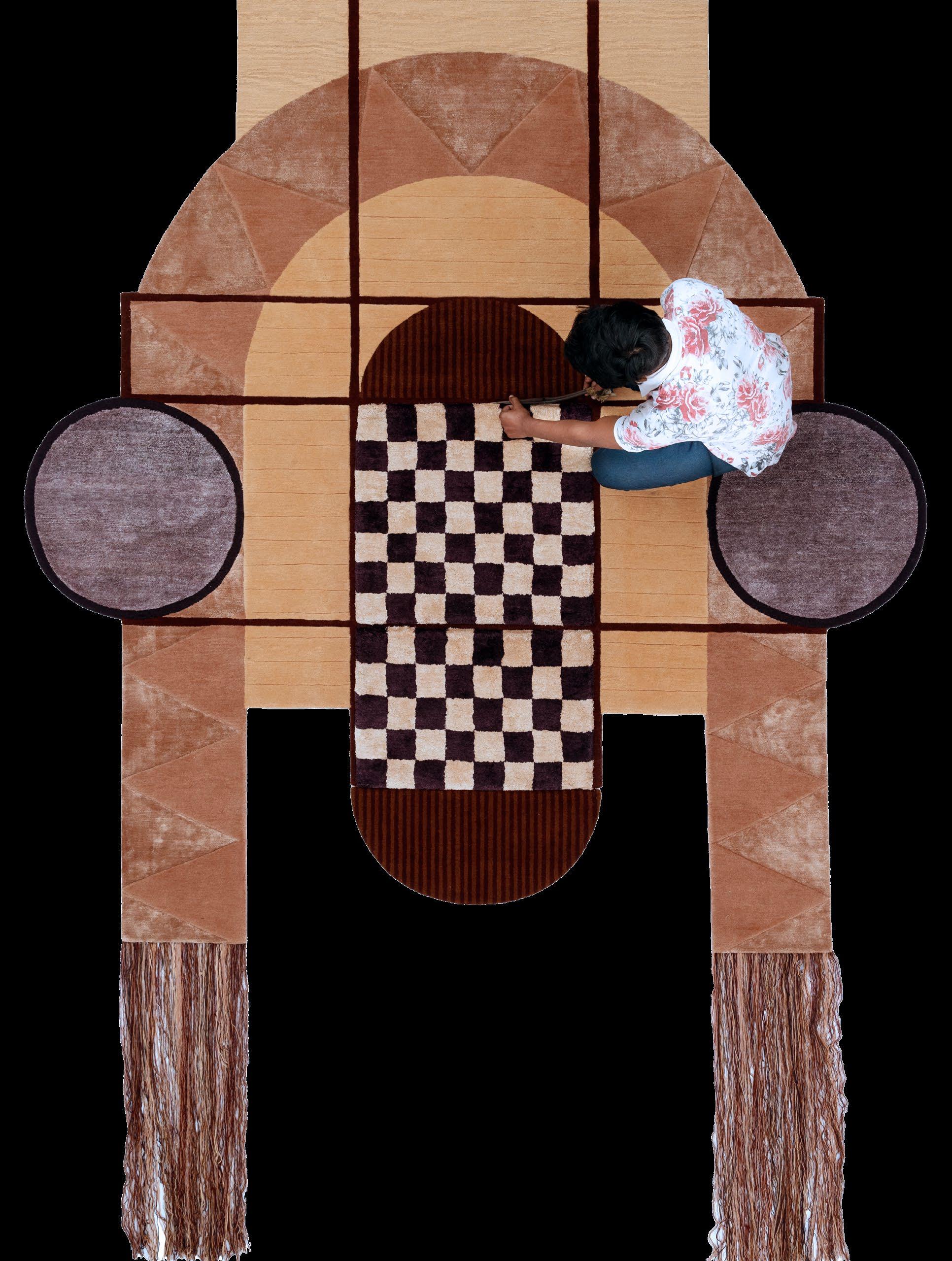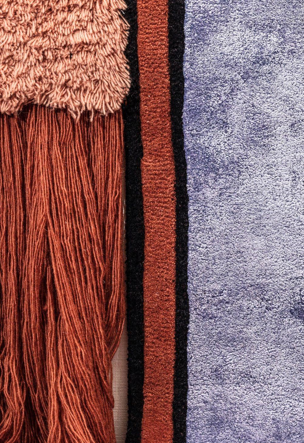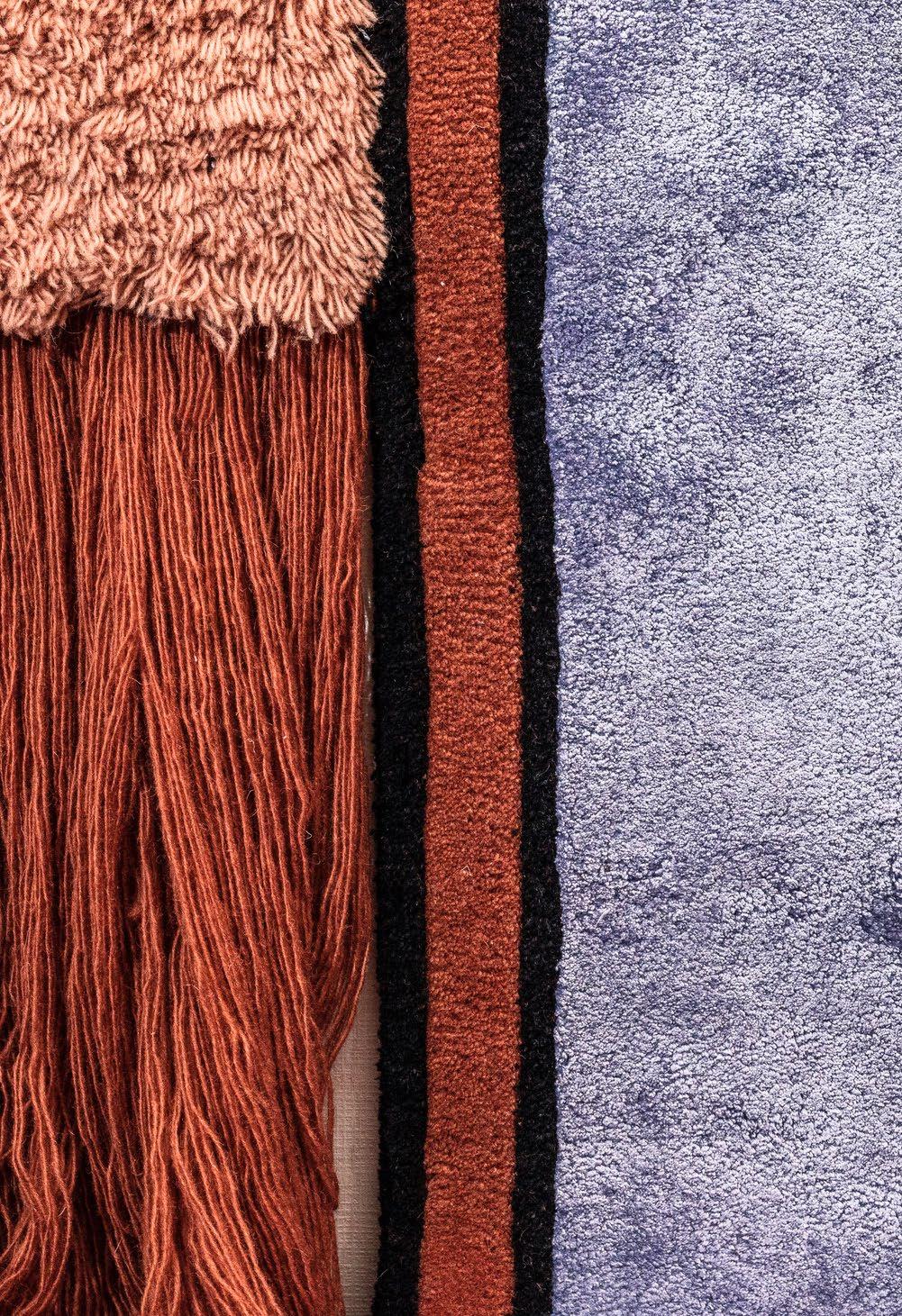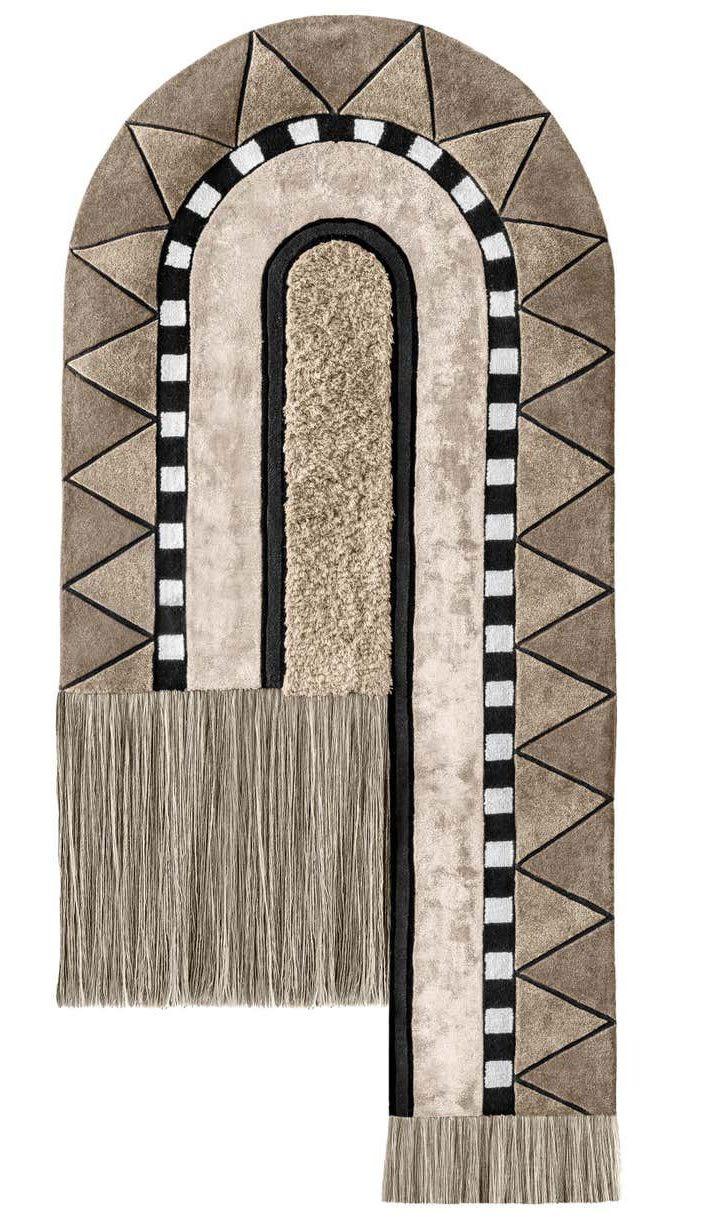 The Crest II track tapestry rug draws inspiration from the starting line of tracks run by athletes in the ancient Olympic Games. Nude neutrals and strong shapes combine to create an eclectic geometric vibe. This rug is hand-tufted in India, made with wool, silk, and shag. Can be paired together with Crest II to create a bigger rug.