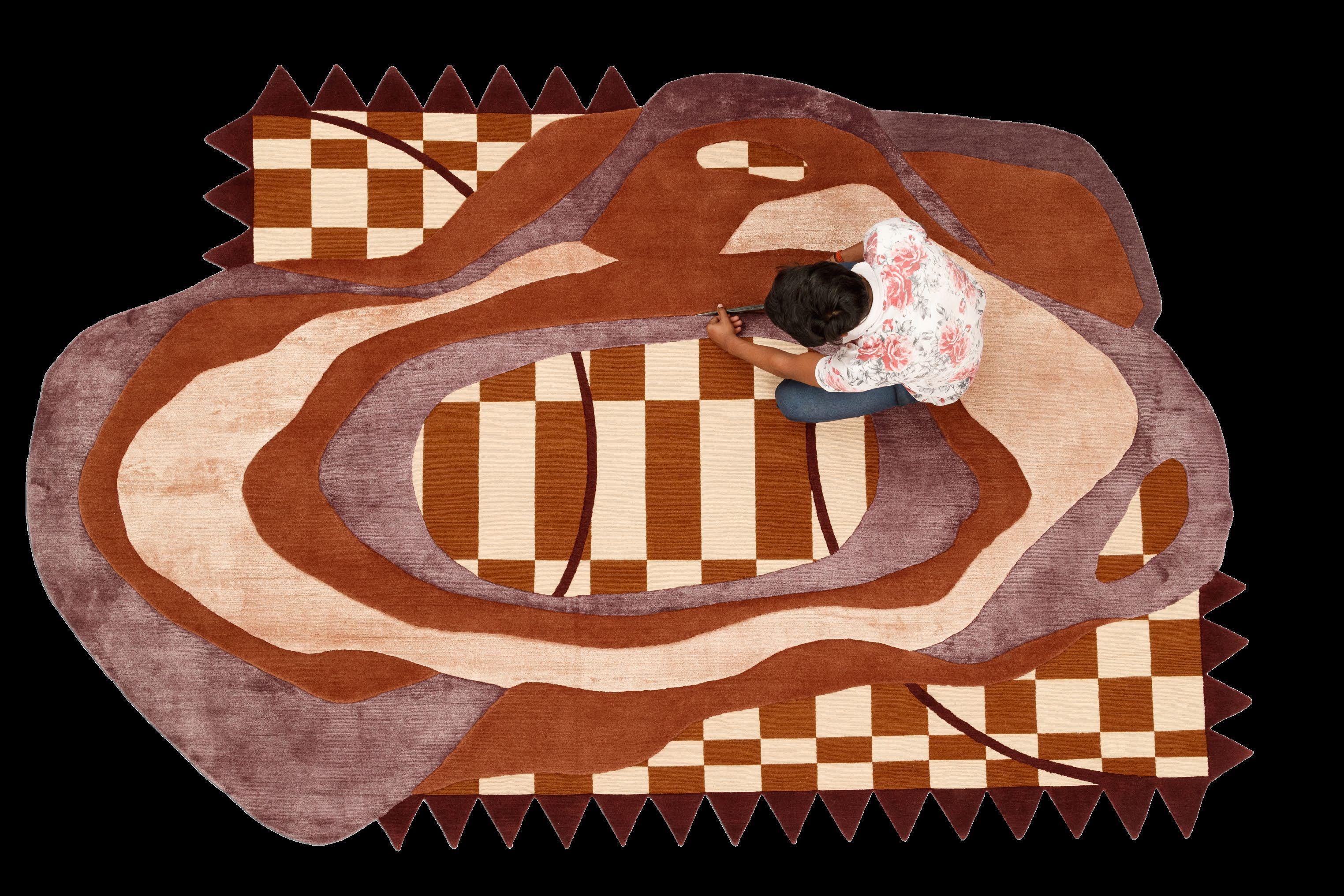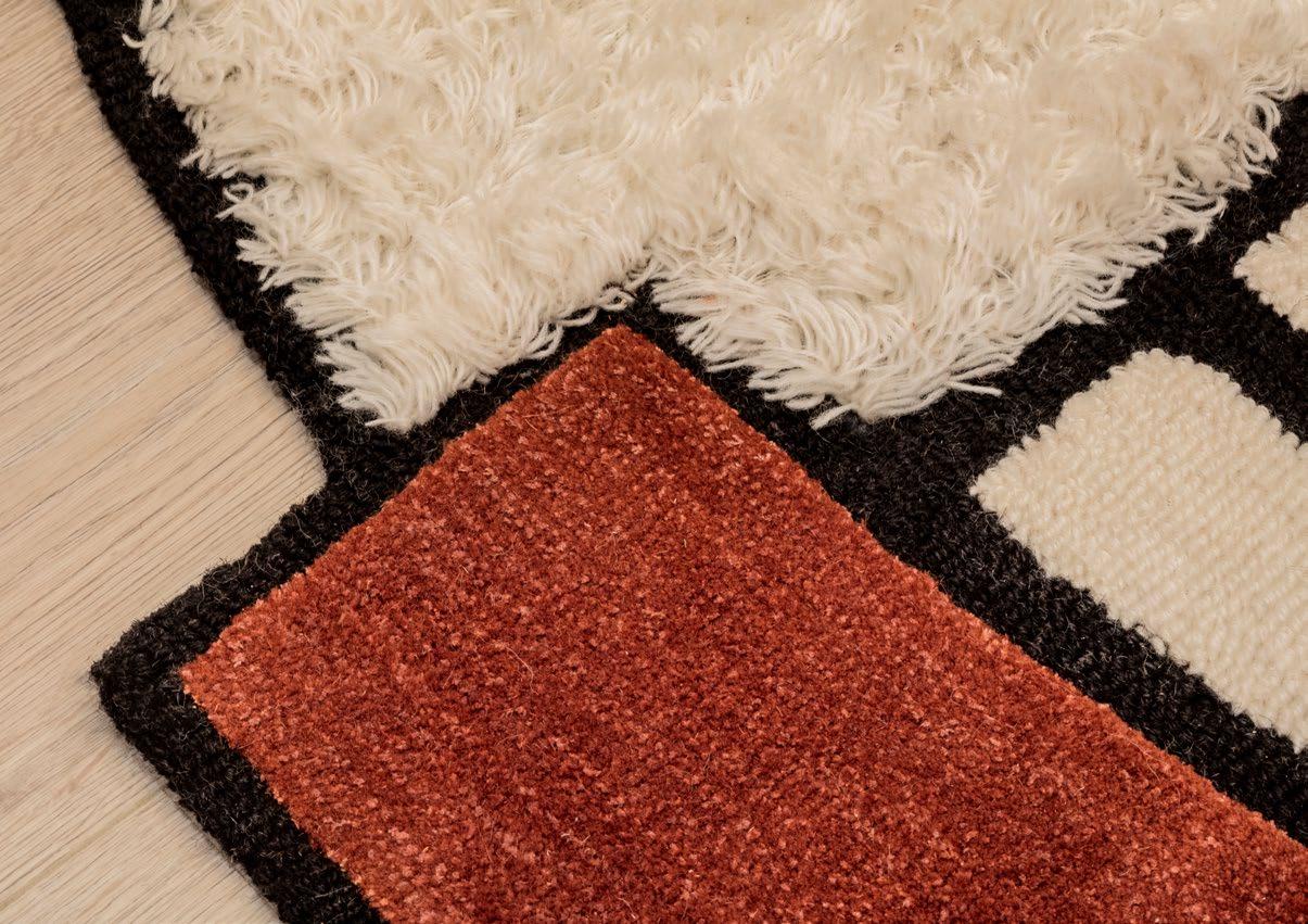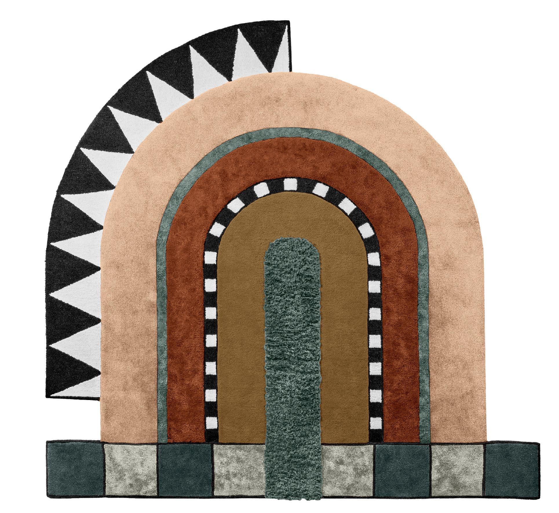 The Crest II track tapestry rug draws inspiration from the starting line of tracks run by athletes in the ancient Olympic Games. Nude neutrals and strong shapes combine to create an eclectic geometric vibe. This rug is hand-tufted in India, made with wool, silk, and shag. Can be paired together with Crest II to create a bigger rug.