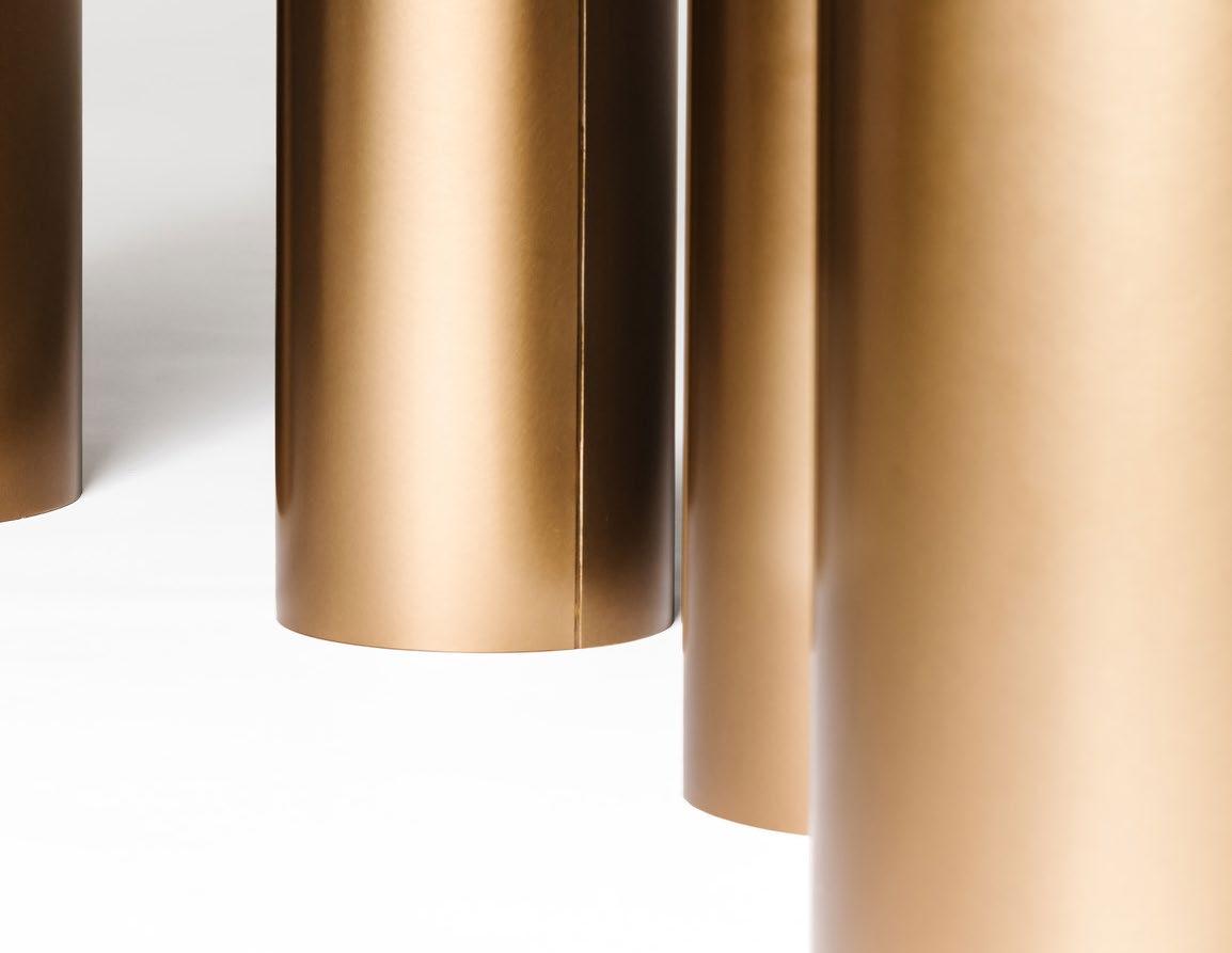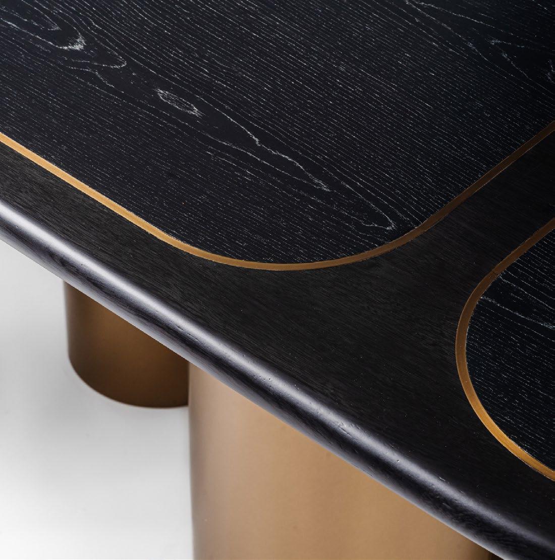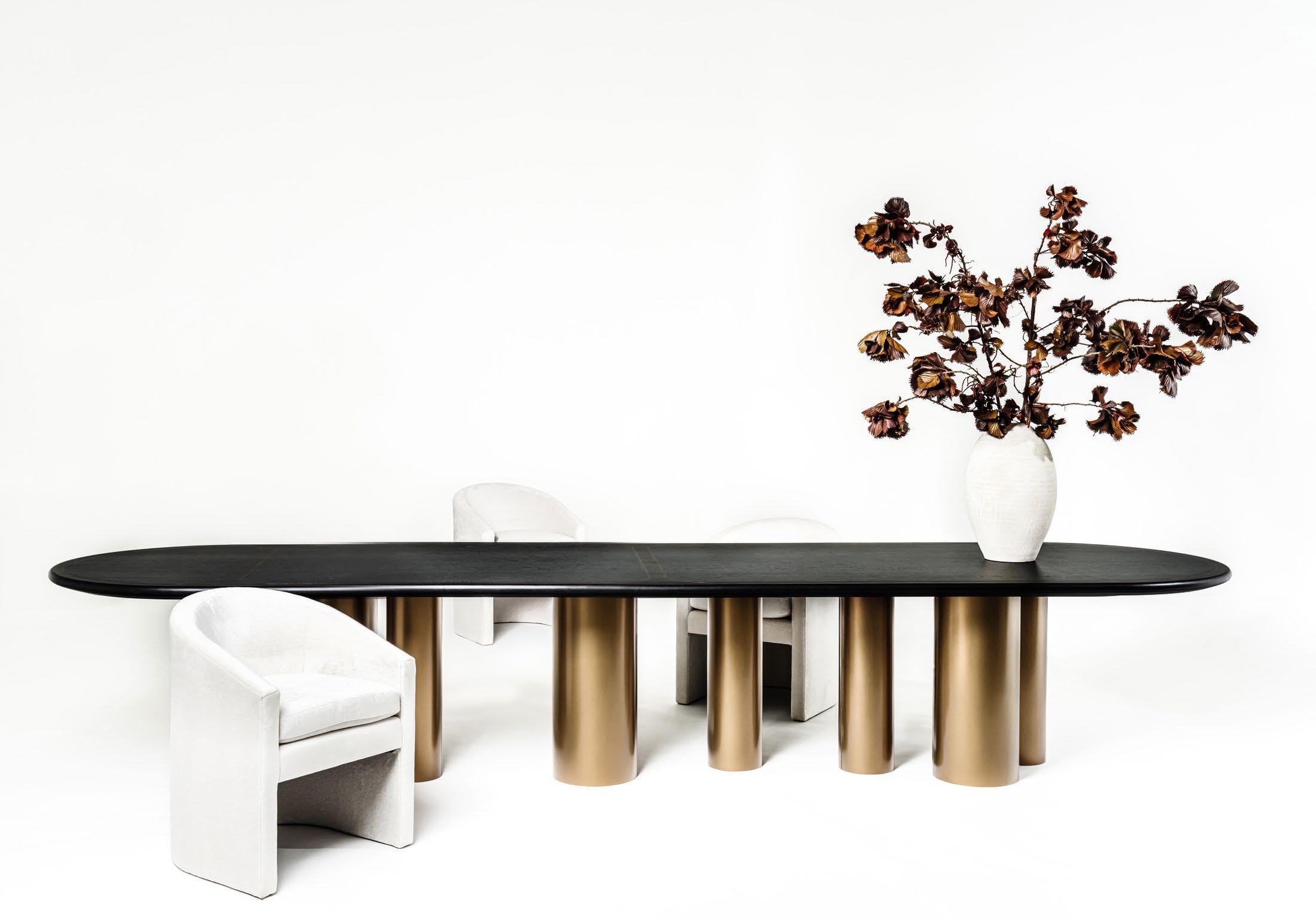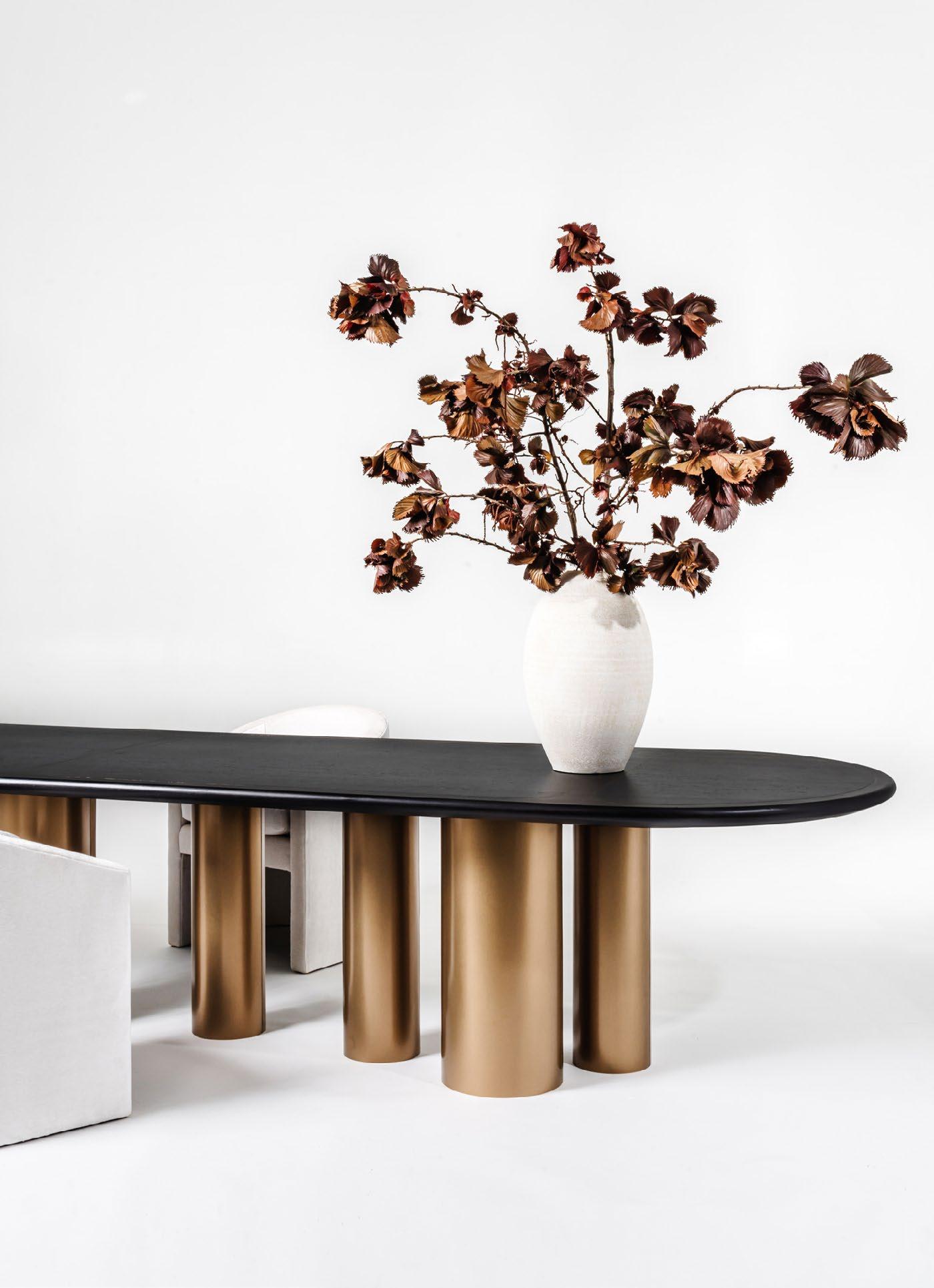 Our Race Track Table smooth cerused wood top lays atop cylindrical plinths.