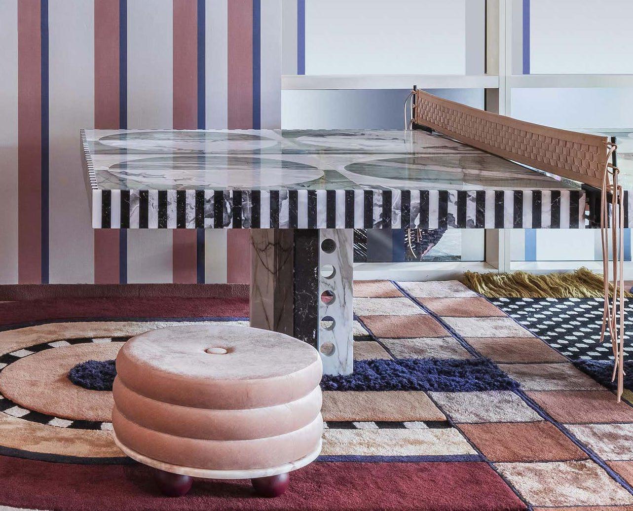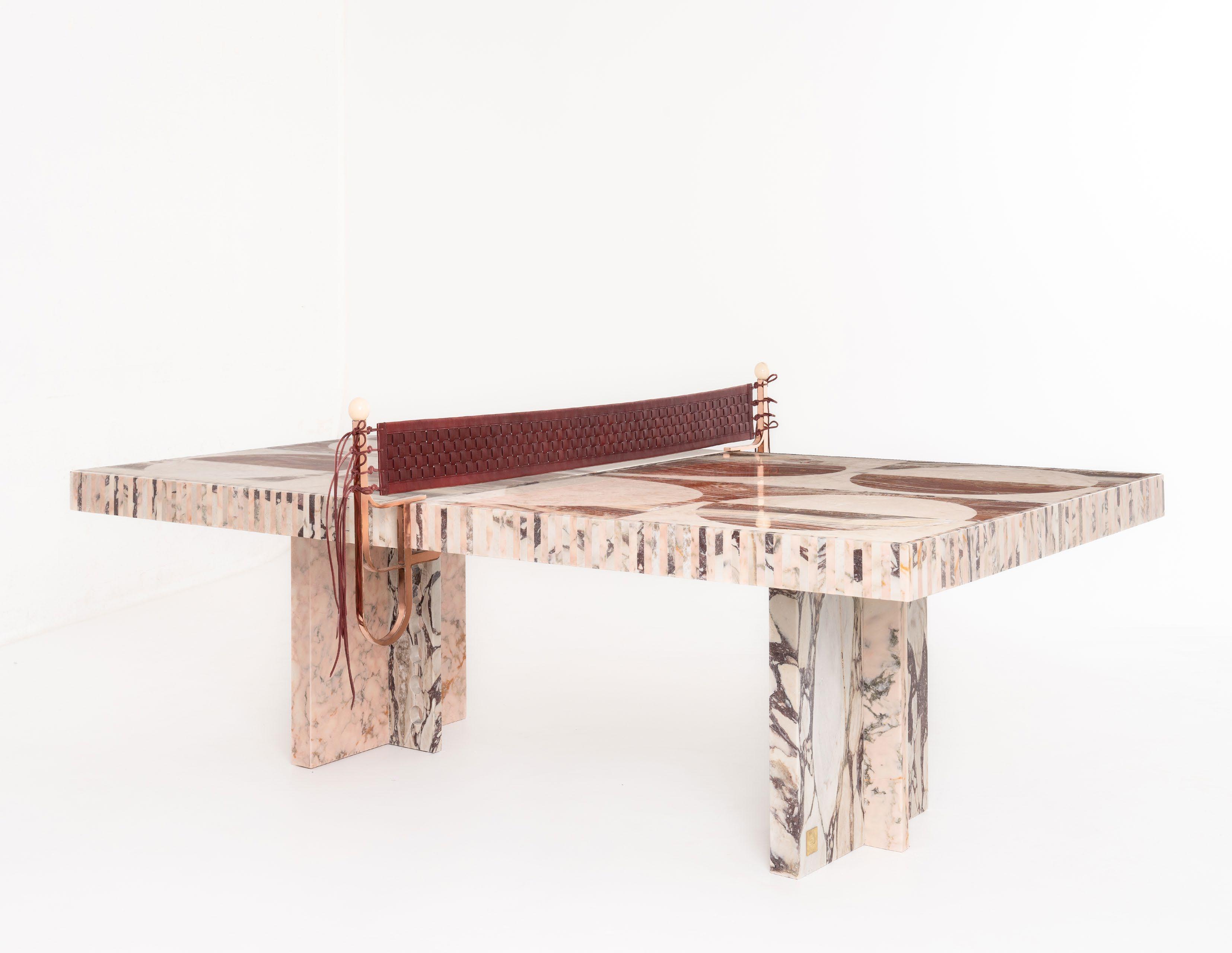 This dining room table combines various marbles of distinct patterns and colors. The versatility and playfulness of sport are displayed in the ability to use it for dinner or for a competitive game of ping pong.