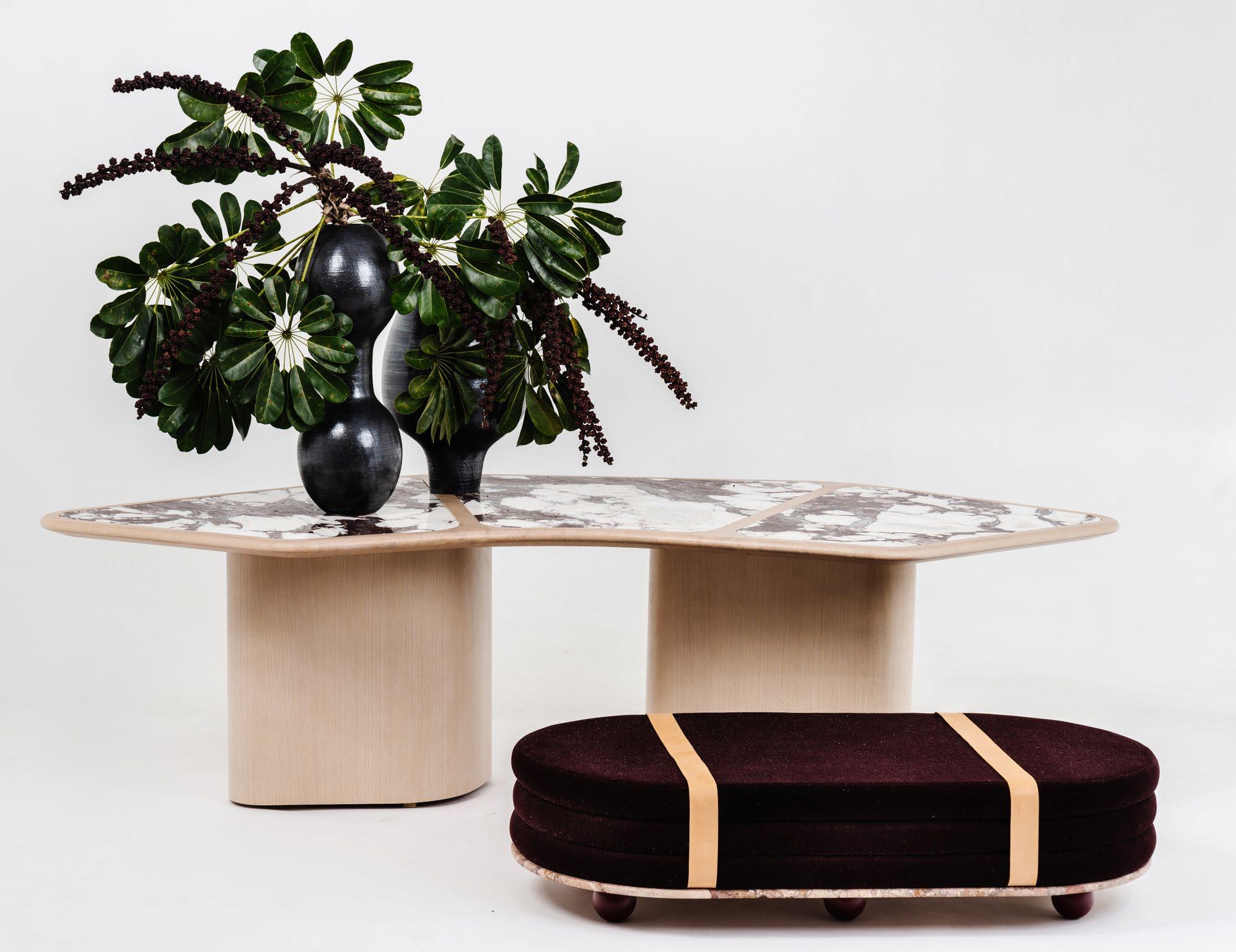 Tiered layers of lush mohair sit amidst a marble plinth and handcrafted oak legs.