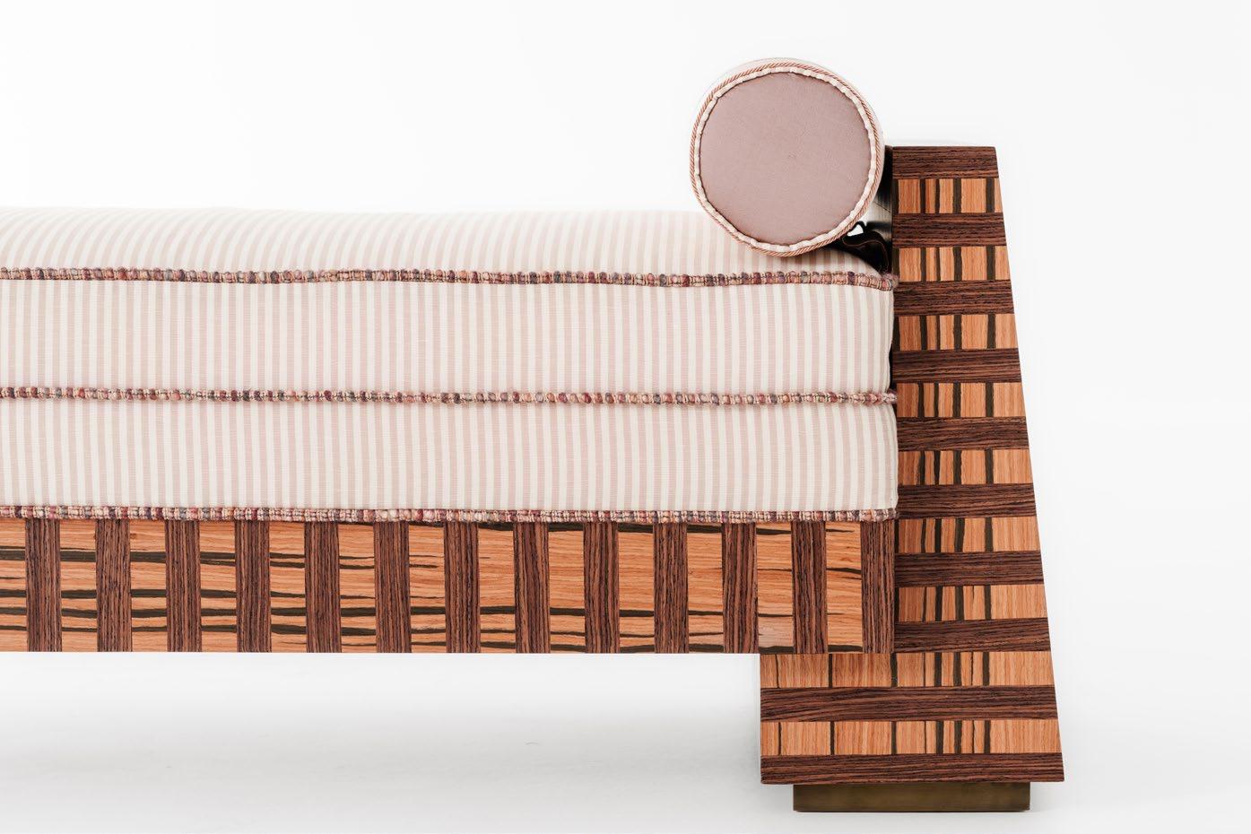 The graphic layering of exotic burled and cathedral grained woods frame the luxe upholstery comprised of a satin twill and linen.