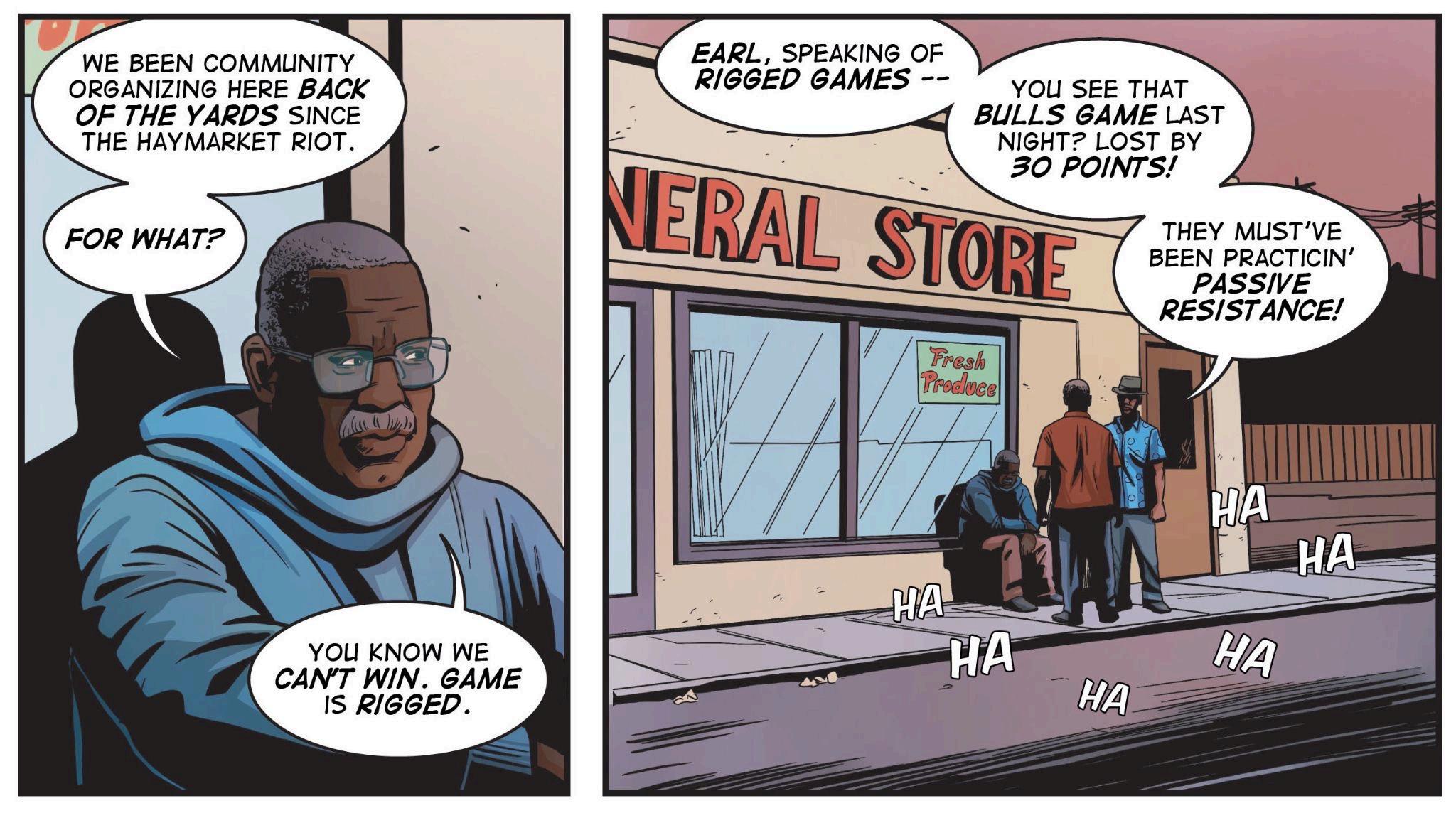 Above: a high school scrap takes on a mythological scale when some basic archetypes are evoked by the imagination of one youngster in the Back of the Yards comic series