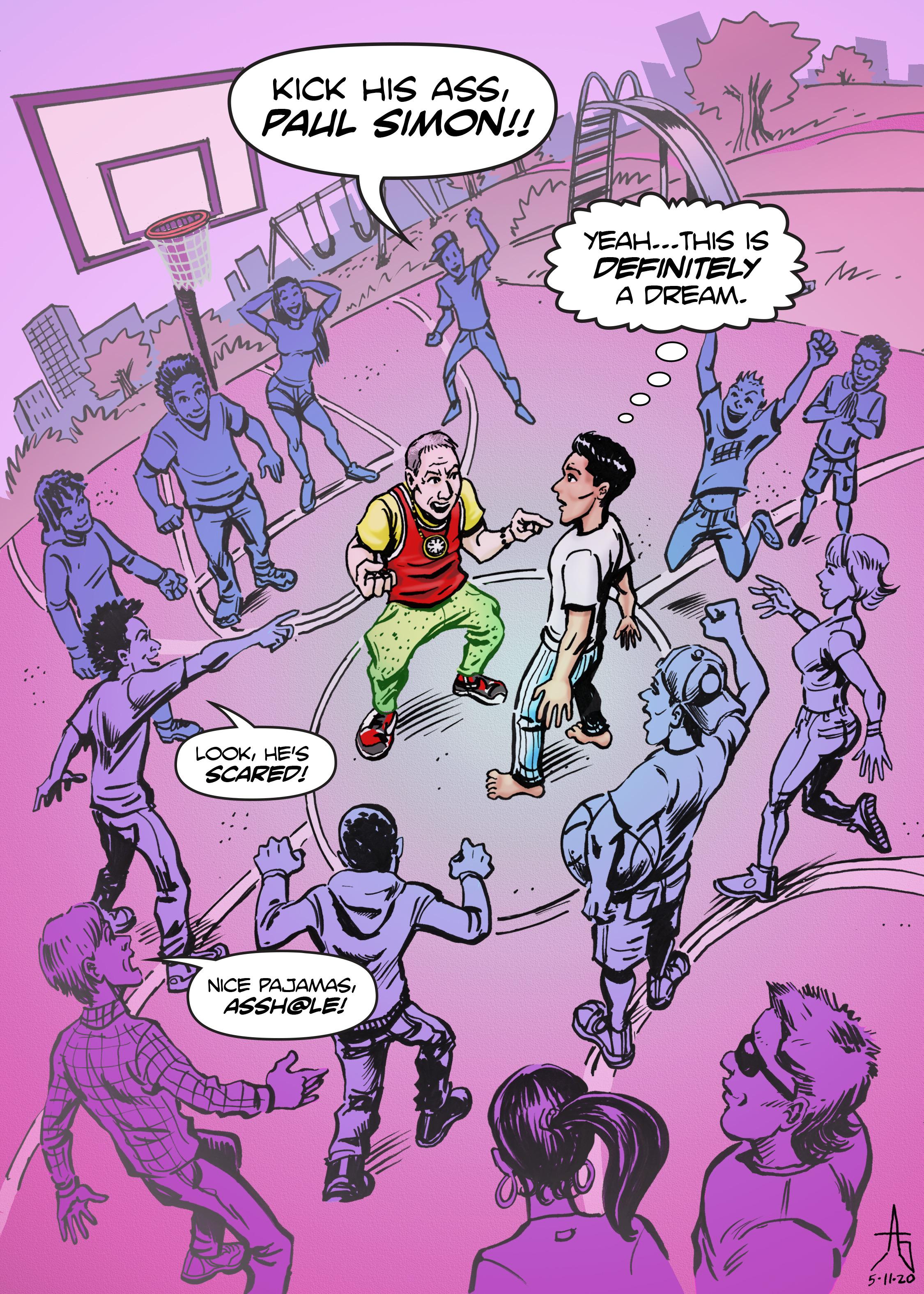 There he was, Paul Simon, taunting me as a pack of onlookers crowded around like some sort of bizarre school playground scene, all presumably waiting to see Paul Simon kick my ass. For what reason, only the dream gods know.