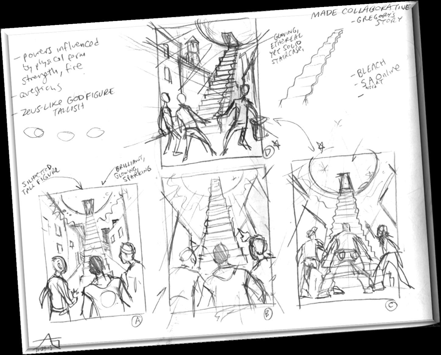 “So, we go out there, this alley, and we see these stairs – like translucent, glowing stairs – rising up out of nowhere and going up towards the sky.