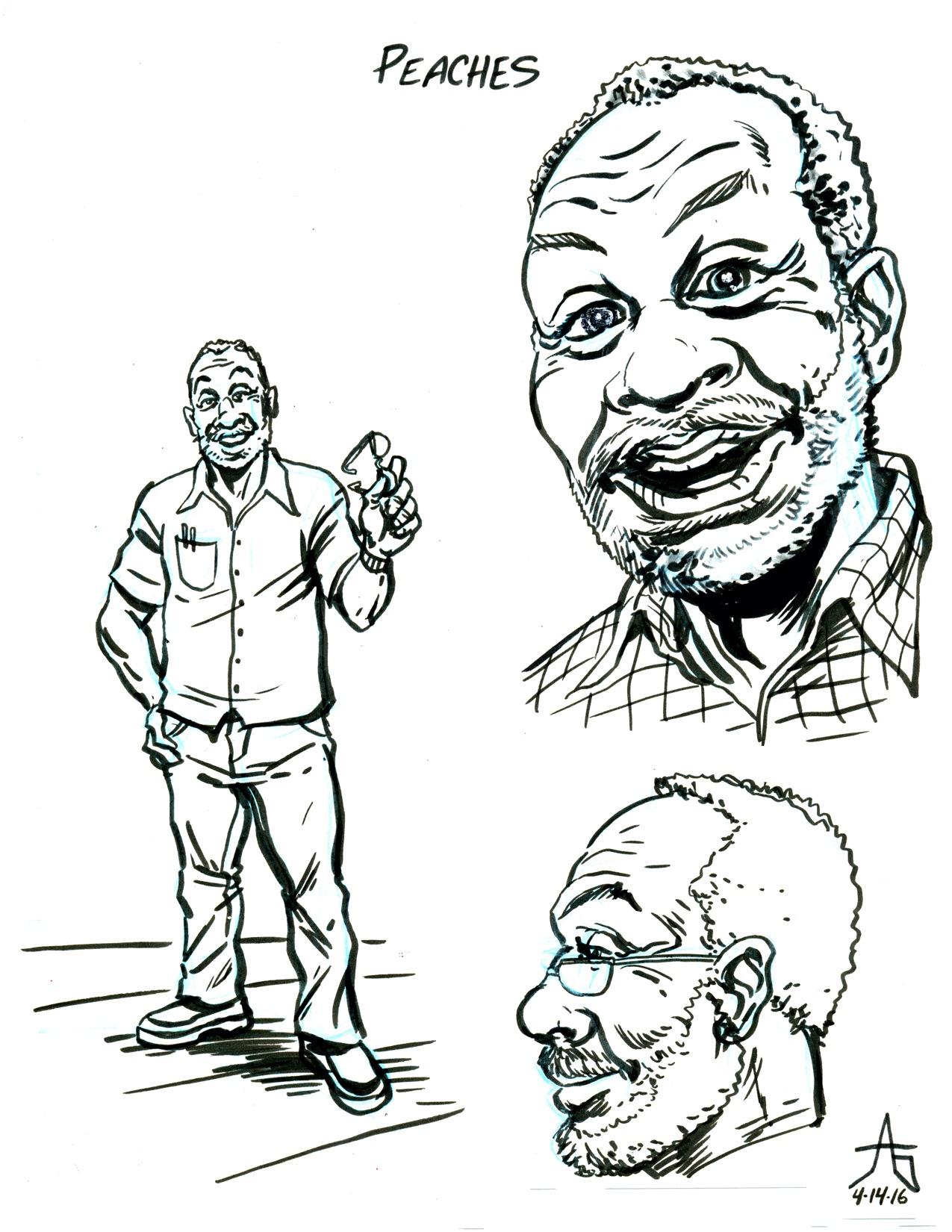 See that guy on the left? I guess that’s me, Jimmy Briseno, some time just before this project started, as illustrated by participating artist John Golden. Looks like I may be deep in thought. About what, you ask? Who the hell knows.