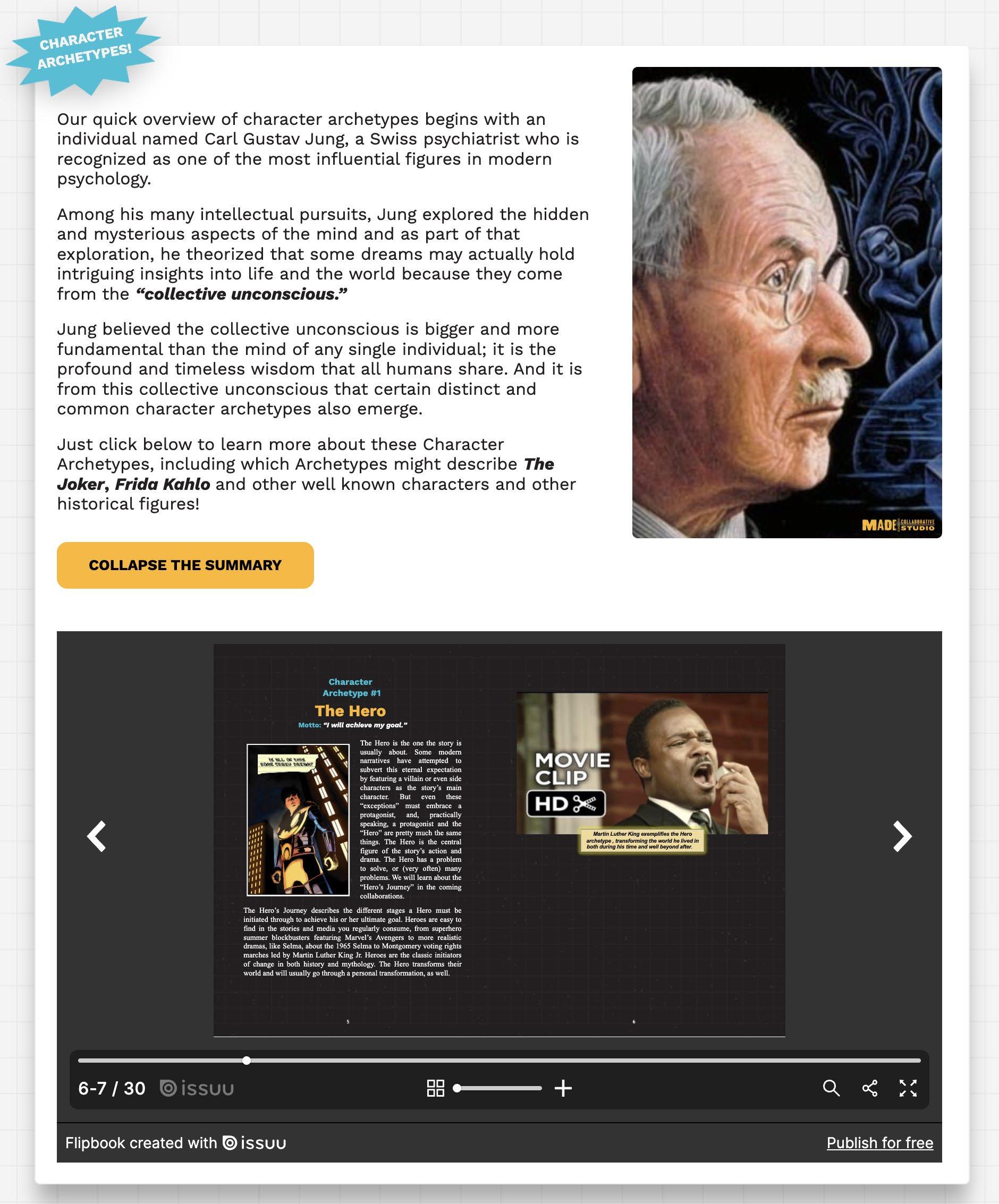 The following pages walk you through a simple five-step process for building your character using our online template. You’ll explore traits, motivations, and archetypes drawing inspiration from Marvel Comics creator Stan Lee and psychologist Carl Jung.