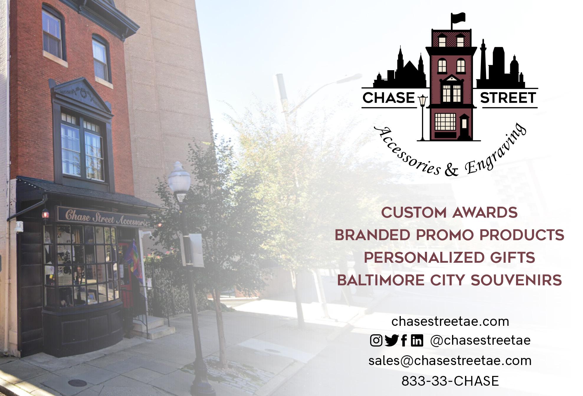 Chase Street Accessories & Engraving offers custom awards, branded promotional products, personalized gifts, and Baltimore City souvenirs. Our state-of-the-art engraving and customization services unite in-house production with an international network of socially-conscious suppliers and vendors. The Chase Street A&E production team’s decoration services include laser engraving, rotary engraving, heat transfer printing, full-color sublimation printing, embroidery, and more. The design team also provides layout, design, and artwork services upon request. From the showroom and workshop in the historic neighborhood of Mount Vernon (Baltimore, MD) Chase Street A&E provides branded awards and swag for corporate events, bespoke favors for parties and reunions, made-to-order gifts for birthdays and anniversaries, and keepsakes commemorating distinctive moments in Baltimore history.