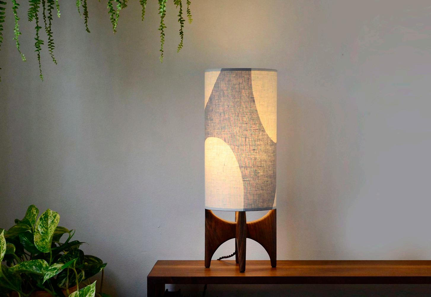 This handcrafted table lamp provides a warm and soft ambient light bringing to your interior a unique piece. Made of a minimalist black walnut lamp base and a unique printed linen shade. The hefty and simple design of the base shows off the natural character of the wood.