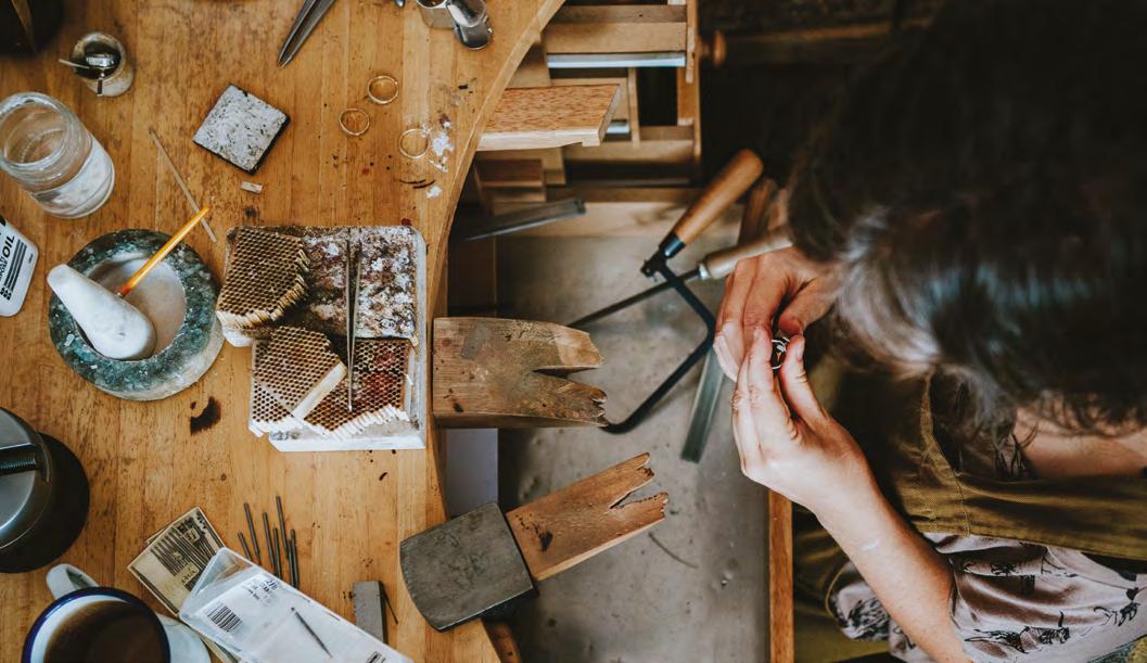 Sarah Ruth Stanford, an artisan jewellery maker and goldsmith who creates timeless sustainable pieces celebrated for their rough-luxe elegance.