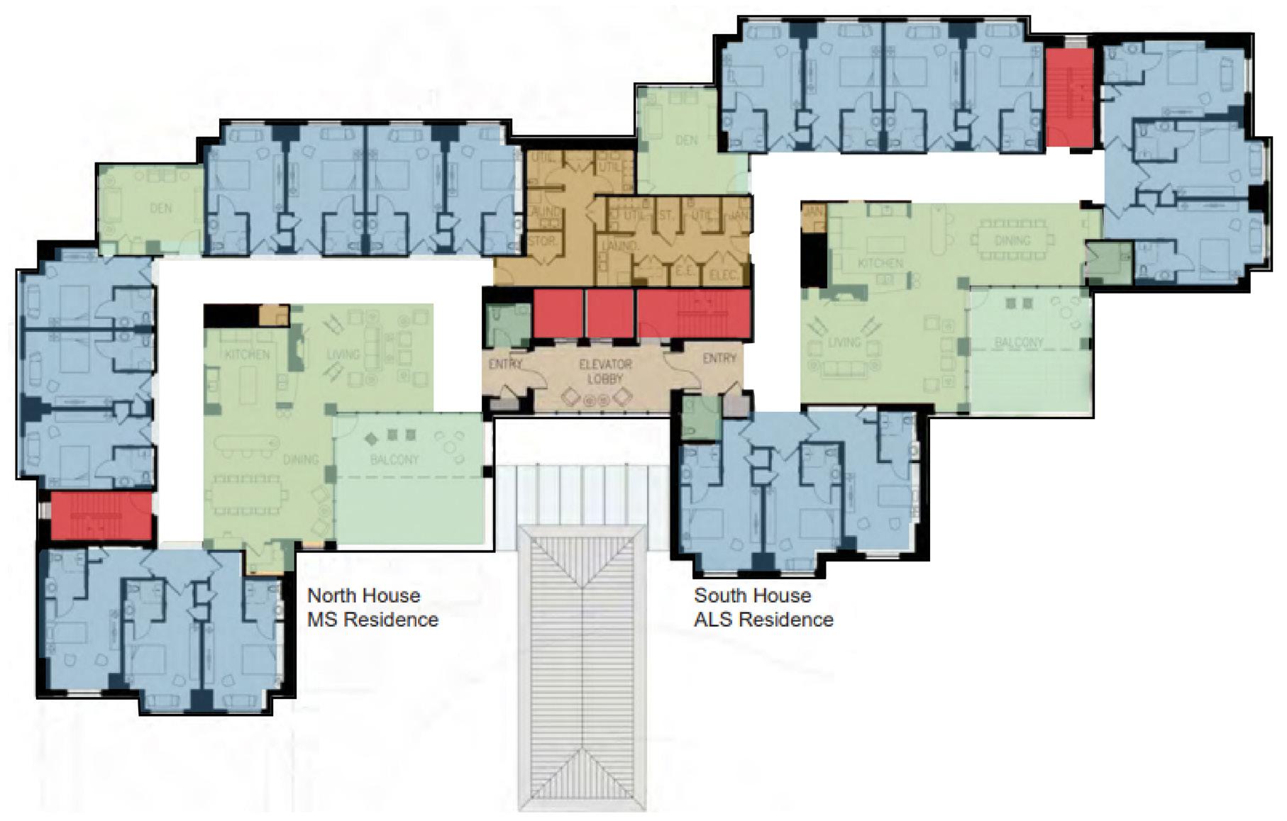 On the unit floors, all amenities and dining spaces are on the left side. If residence get lost or disoriented, they can follow the corridor and be reassured that eventually they will walk into a communal space on the left side. Residence have access to multiple outdoor decks and seating choices. Private bedrooms face into each other.