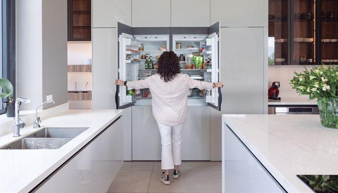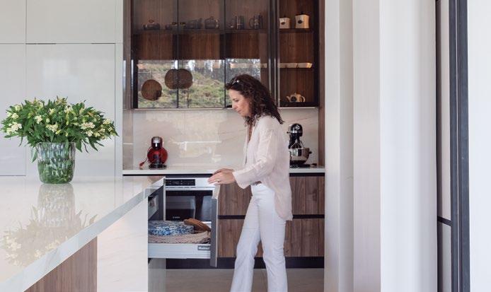 Un verdadero reto, que hubiera sido imposible de lograr sin la tecnología adecuada como la campana oculta dentro de la isla, o los herrajes Blum que permiten aprovechar cada rincón para lograr el almacenamiento que necesita una familia.