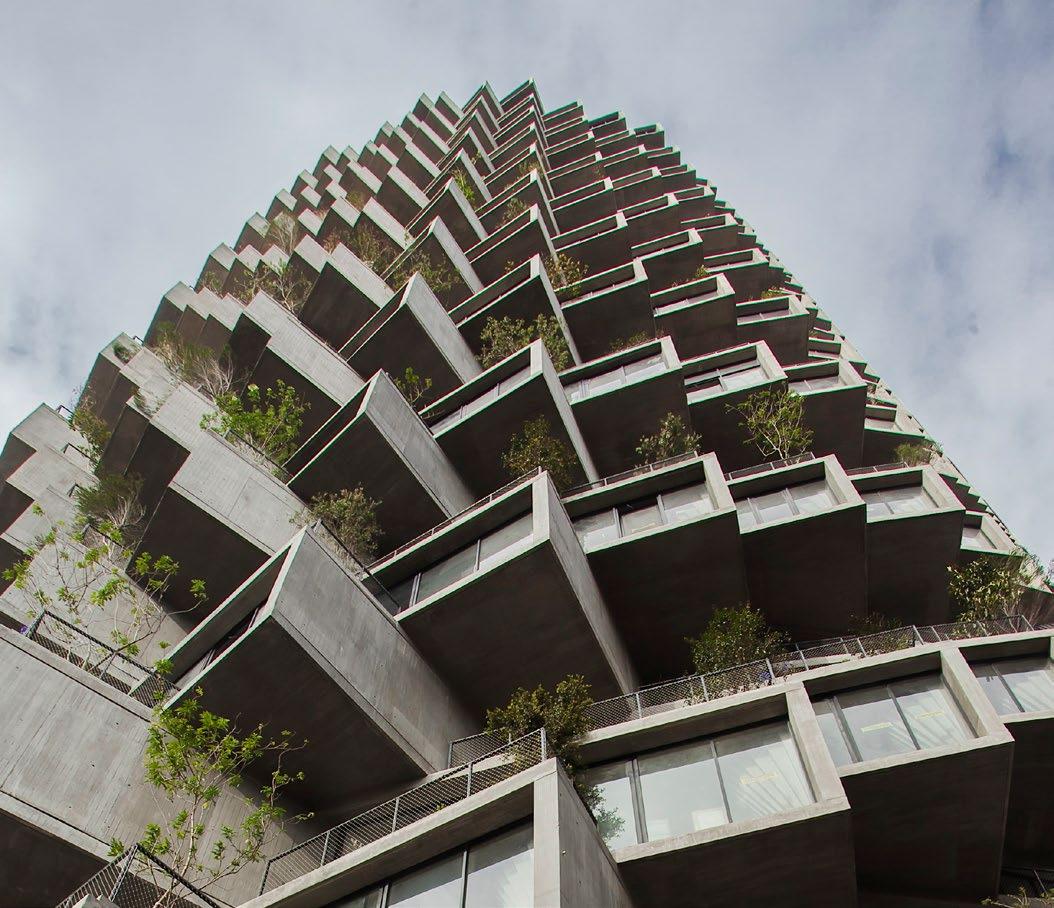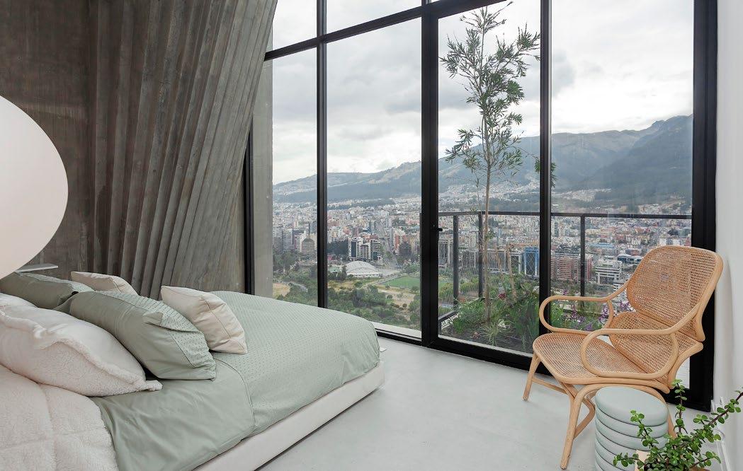 El concepto del edificio más alto de Quito es llevar la naturaleza nativa del parque La Carolina a la fachada a través de la incorporación de una maceta escultórica hecha en hormigón que se introduce dentro de los departamentos.