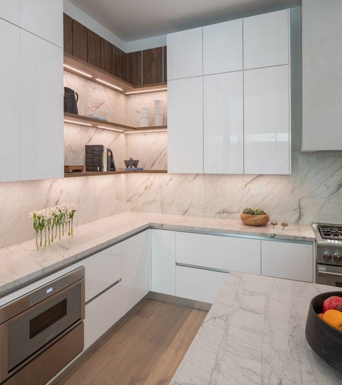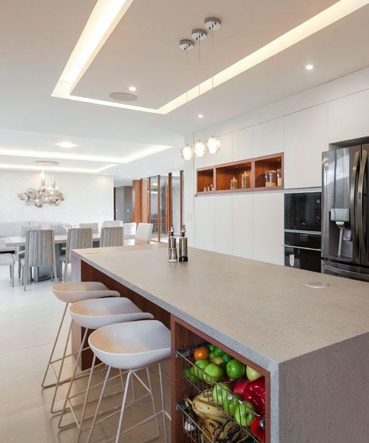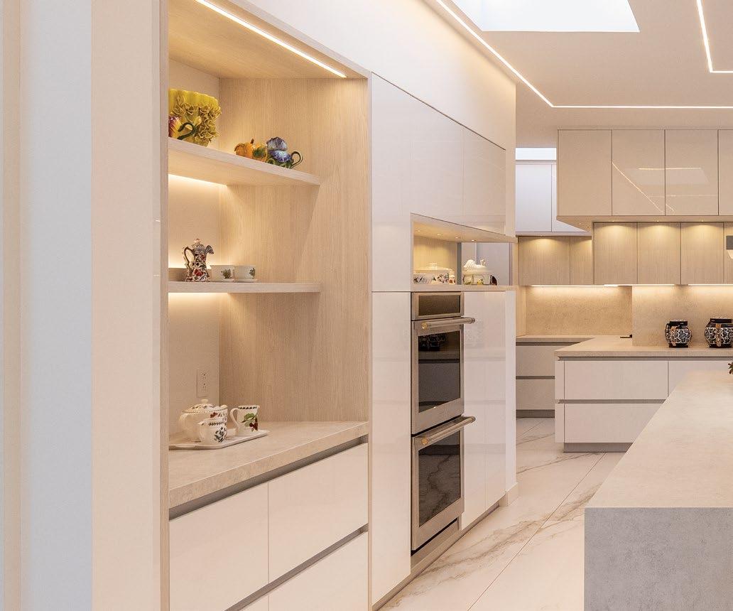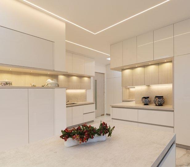 laca alto brillo blanca / melamínico niebla syncro / perfil gola aluminio / mesón Dekton Lunar de Cosentino