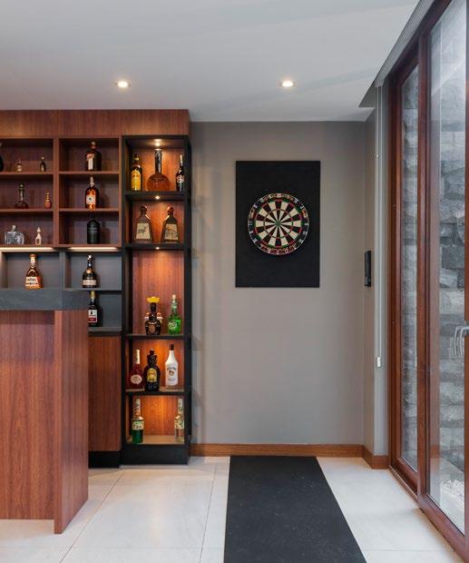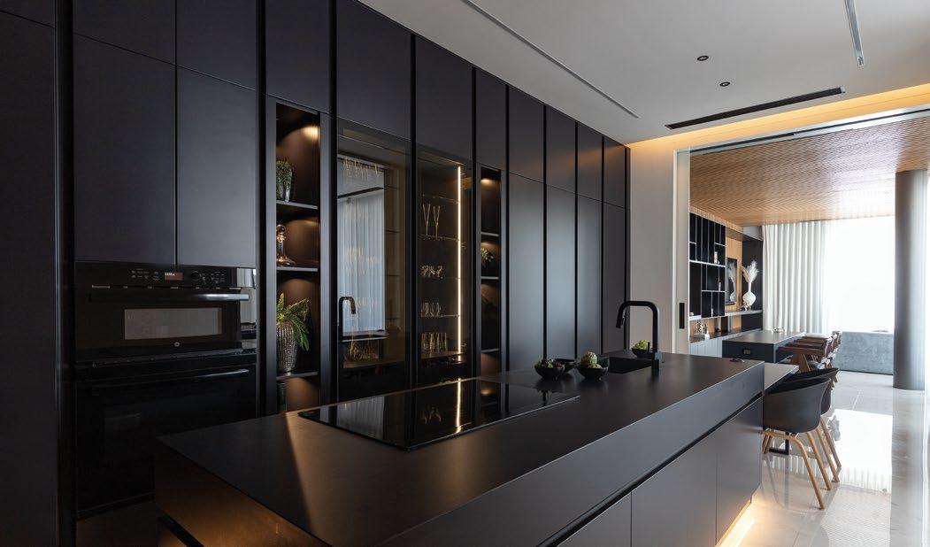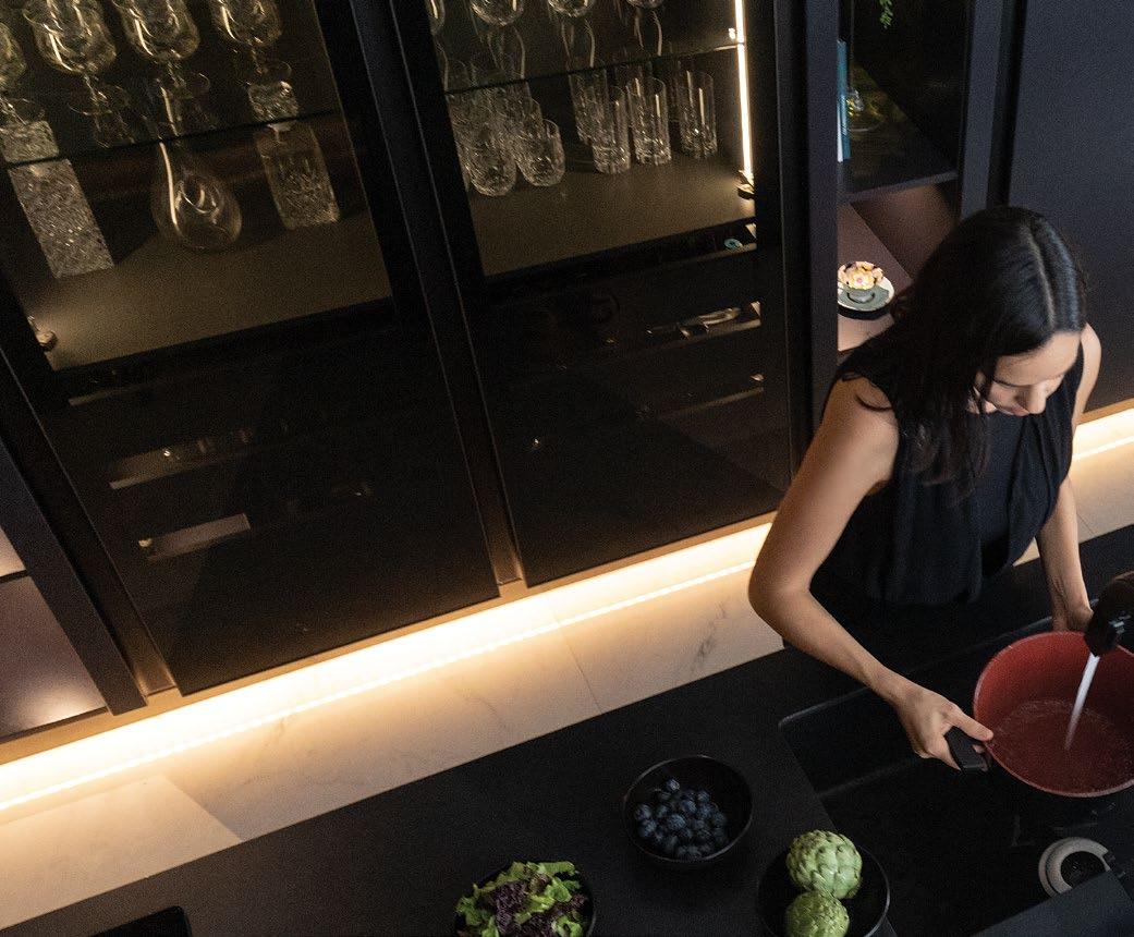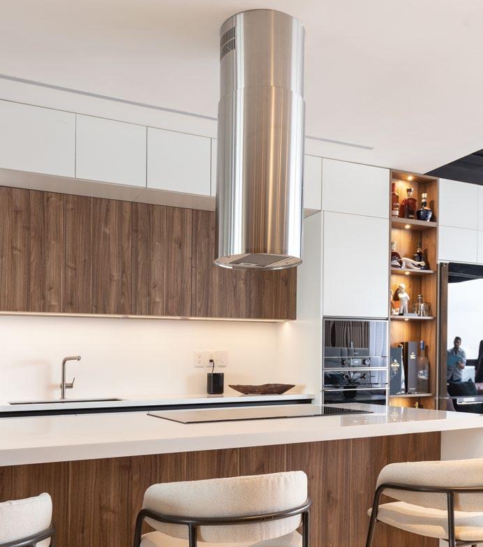 Se desarrolló un concepto oscuro, moderno y sofisticado para crear el bar. En esta ocasión, utilizamos la colección Neo con una laca boreal mate, e incorporamos agarraderas para combinar con los electrodomésticos.