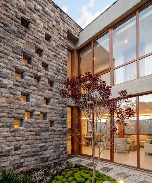 Estos muros cumplen una función estratégica; abrir espacios a pequeños patios interiores que definen grandes ventanales con una privacidad controlada. Con este recurso, la casa trata de capturar el paisaje cercano y lejano a través del vacío y el enmarcamiento, pues se encuentra junto a un paisaje montañoso. Los materiales de fachada exterior son rugosos, texturados y en colores naturales matizados que hacen un enlace perfecto con la vegetación.