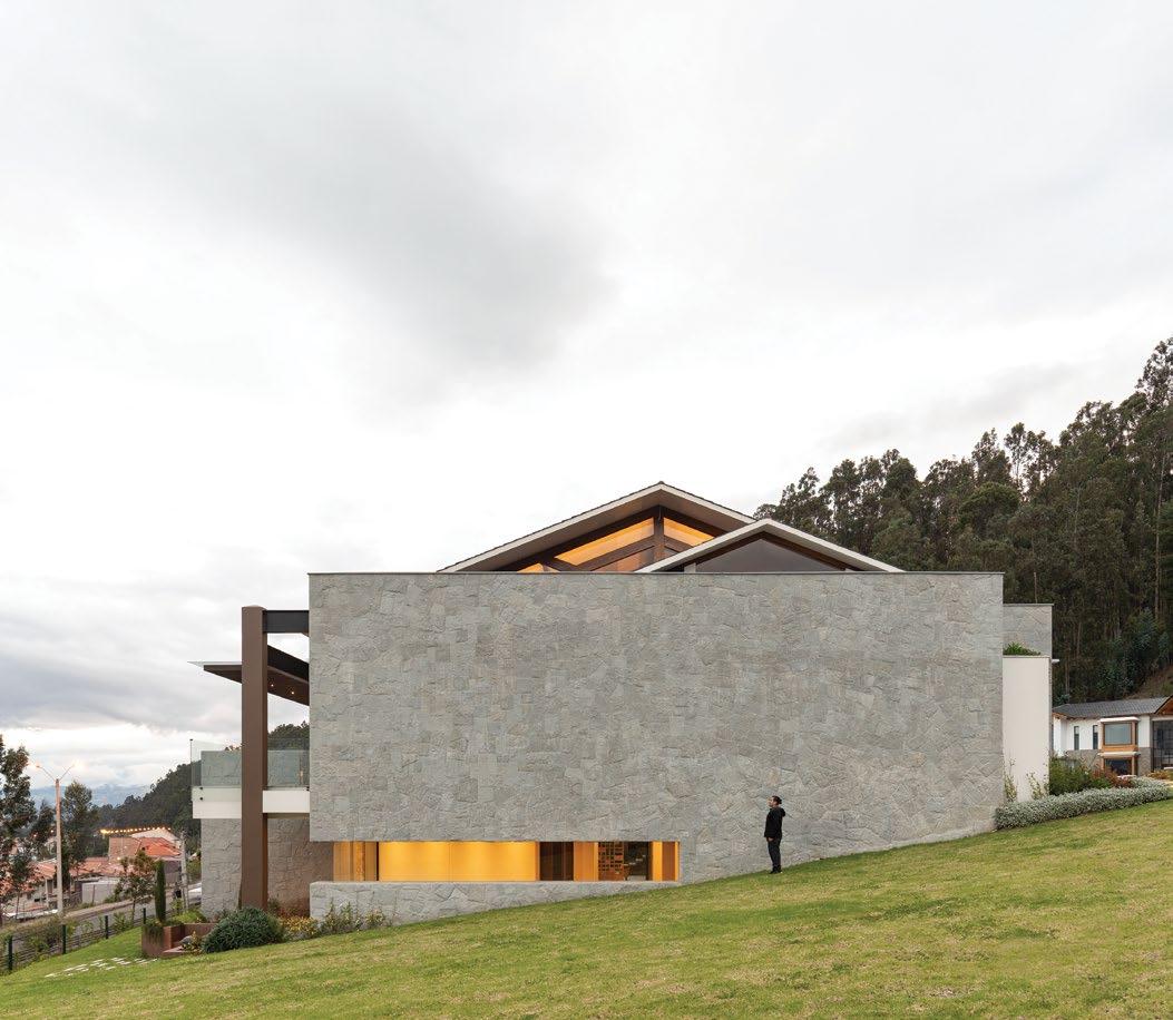 Esta vivienda trata de rescatar elementos de la arquitectura tradicional cuencana como las cubiertas inclinadas, que es un recurso que se puede apreciar mejor en el área social pues el cielo raso sigue la forma de la cubierta creando ambientes integrados, diáfanos con paredes a media altura, recursos que crean una atmósfera cálida con sabor a historia, pues tiene además una colección de materiales naturales que refuerzan la idea tradicional y se los puede apreciar tanto en la fachada como en espacios interiores.