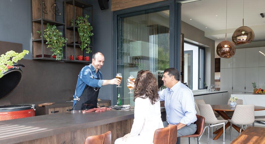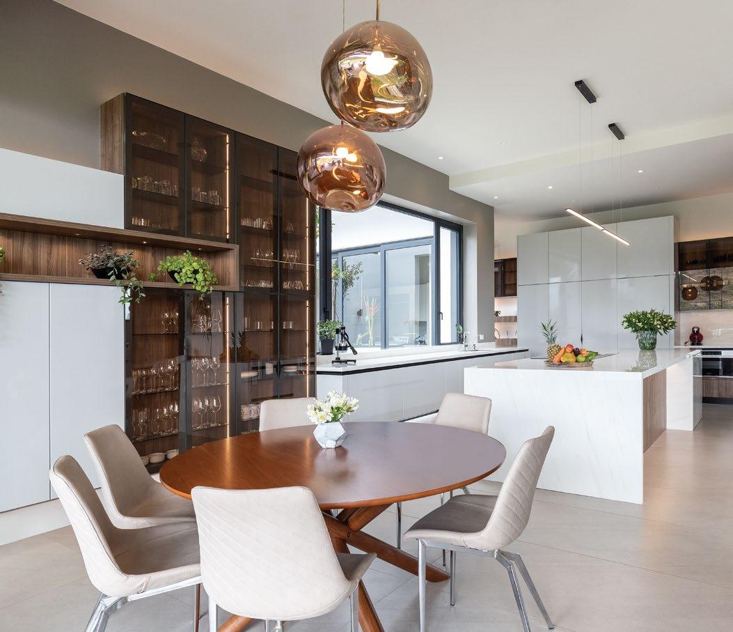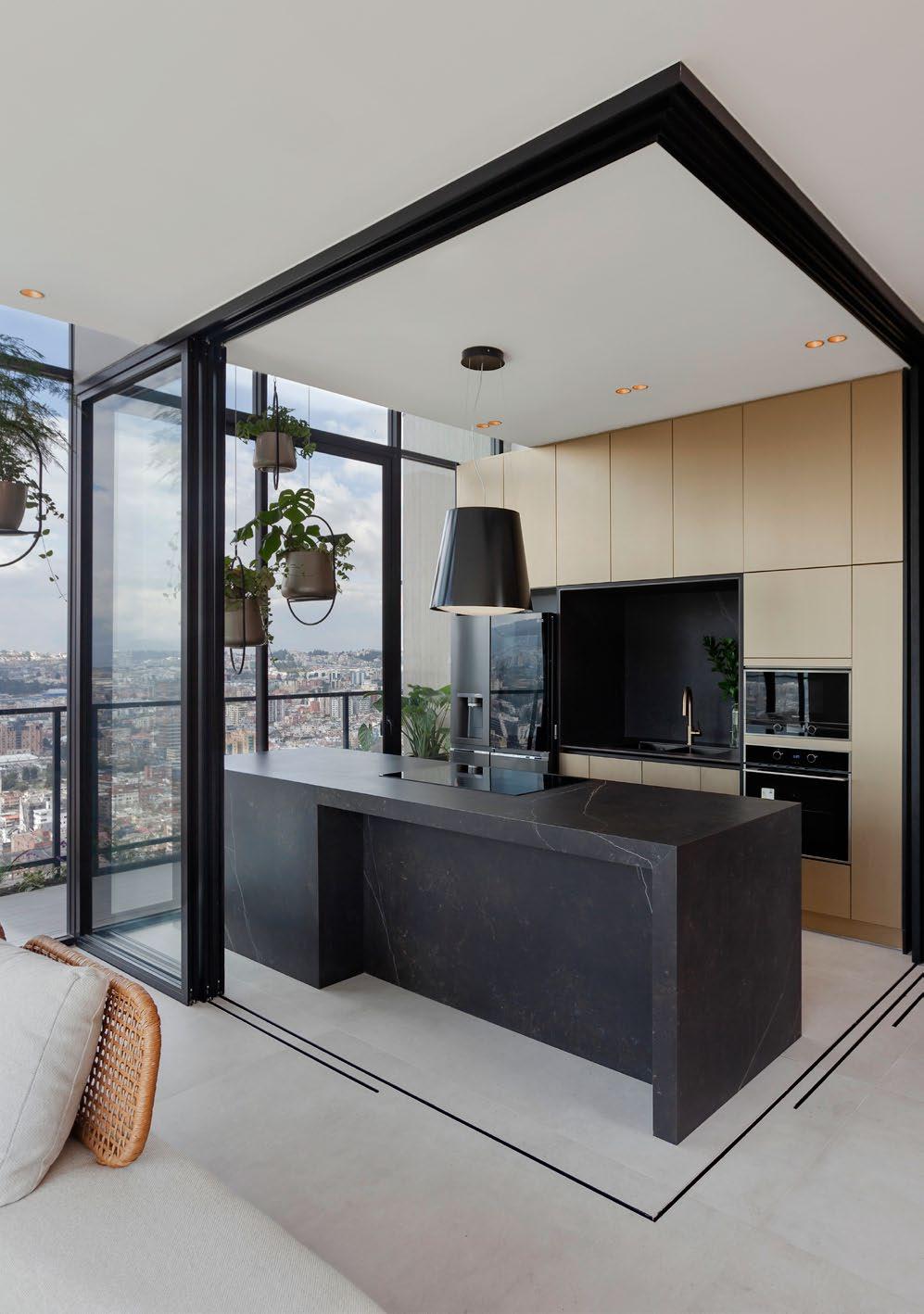 El concepto de la cocina como objeto se materializó evitando el uso de módulos altos. Además, la cromática de la laca Boreal y los perfiles Duo negro aportaron para convertir este espacio en un elemento atrevido y elegante.