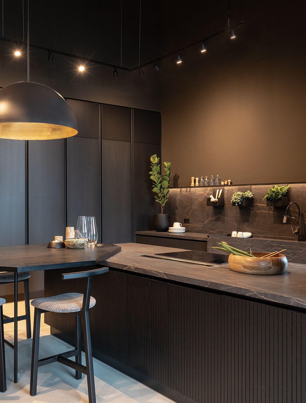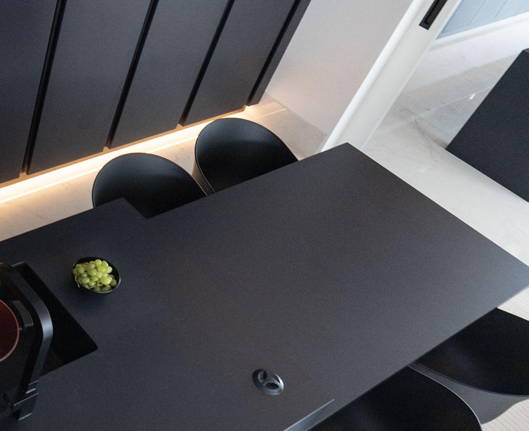 laca cobalto metalizada / mesón Dekton Taga de Cosentino / perfil gola negro