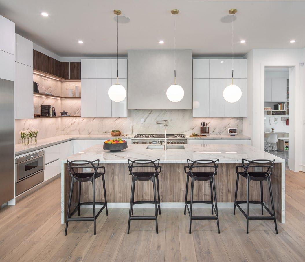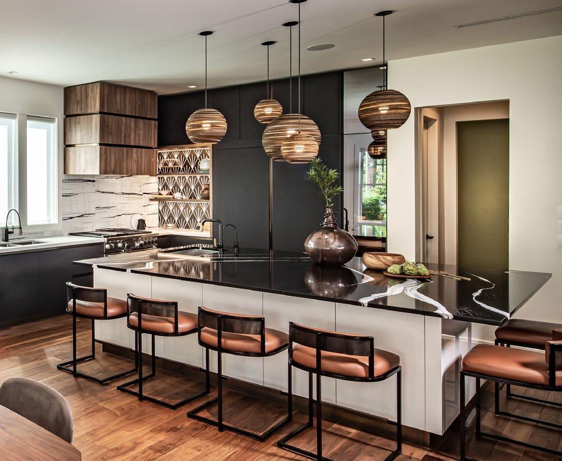 Un grupo de lámparas con forma de globo de cartón reutilizados se suspenden sobre la isla monumental, coronada por una losa de cuarzo blanco y negro para pulir el espacio cautivador.