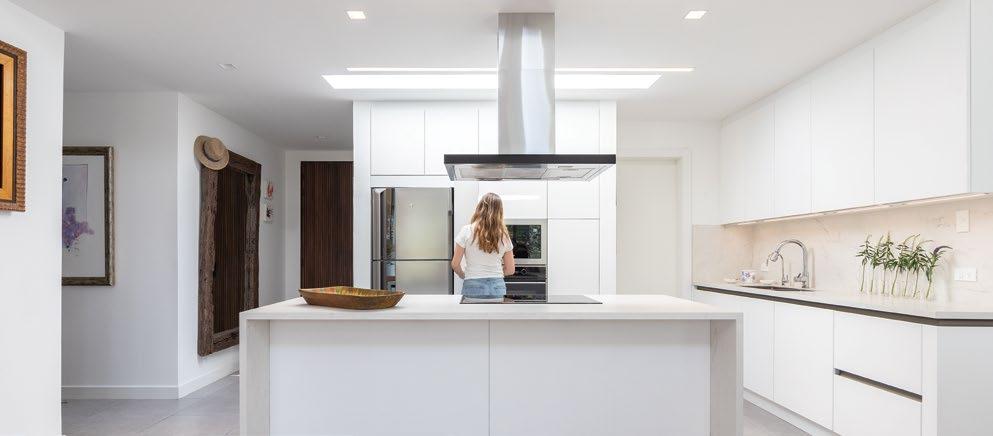 El primero fue integrar la iluminación natural a través de la doble ventana sobre mesón de fregadero, el tragaluz y mamparas de puertas corredizas que dan al área del porche.